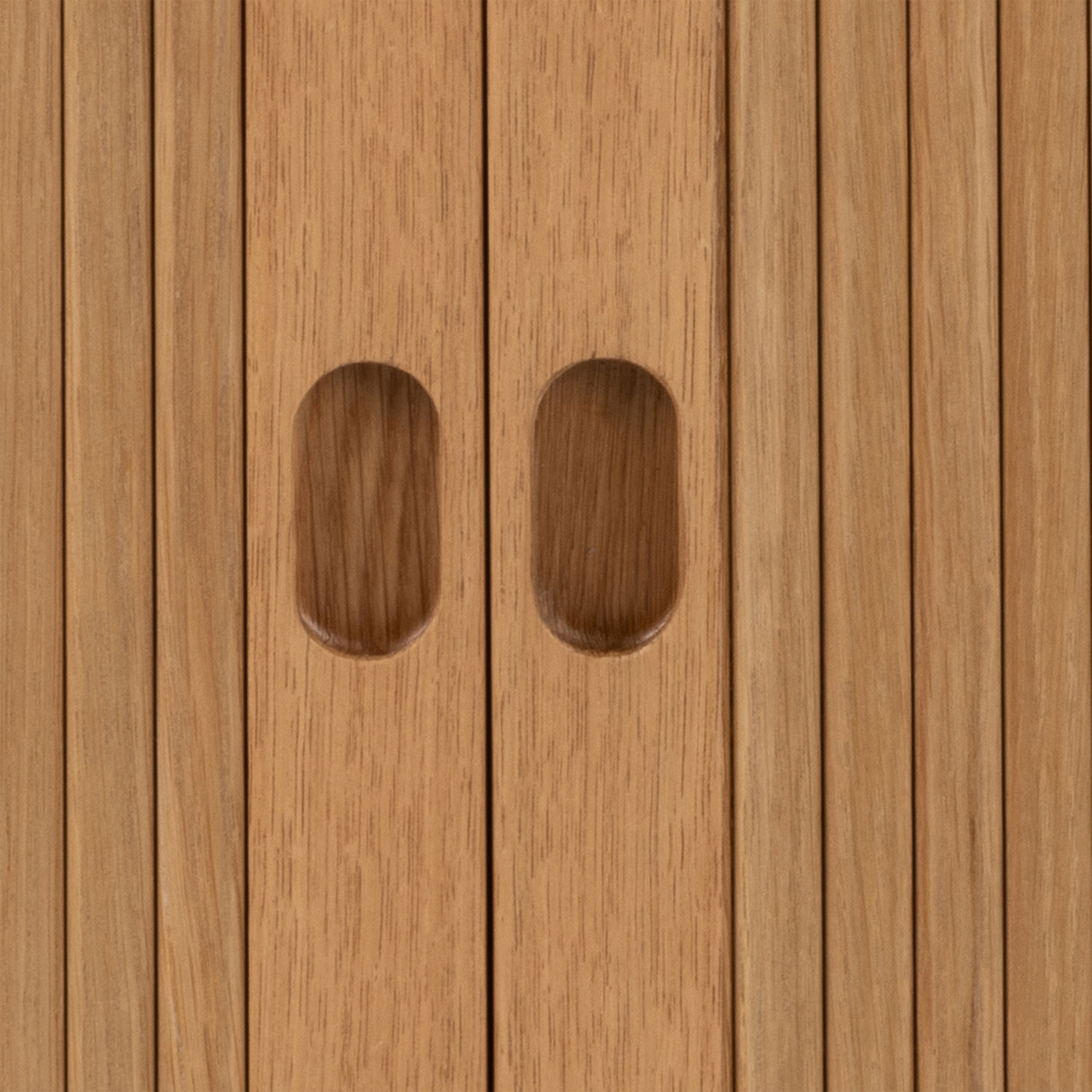 Complete your bedroom ensemble with this contemporary bedside table, featuring a rich oak effect finish. The innovative design includes a lamella design and versatile sliding and tambour doors, offering both aesthetic appeal and practical storage solutions.