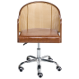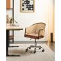 Bring a warm, natural touch to your office with this elegant chair, featuring a smooth faux leather seat in a rich brown tone. The gently curved backrest showcases an airy Viennese braid pattern crafted from resilient PE rattan, creating a light and sophisticated look. Supported by a sturdy chrome base with pneumatic height adjustment and smooth gliding wheels with safety brakes, this chair is designed to offer both comfort and a refined aesthetic that enhances any workspace.