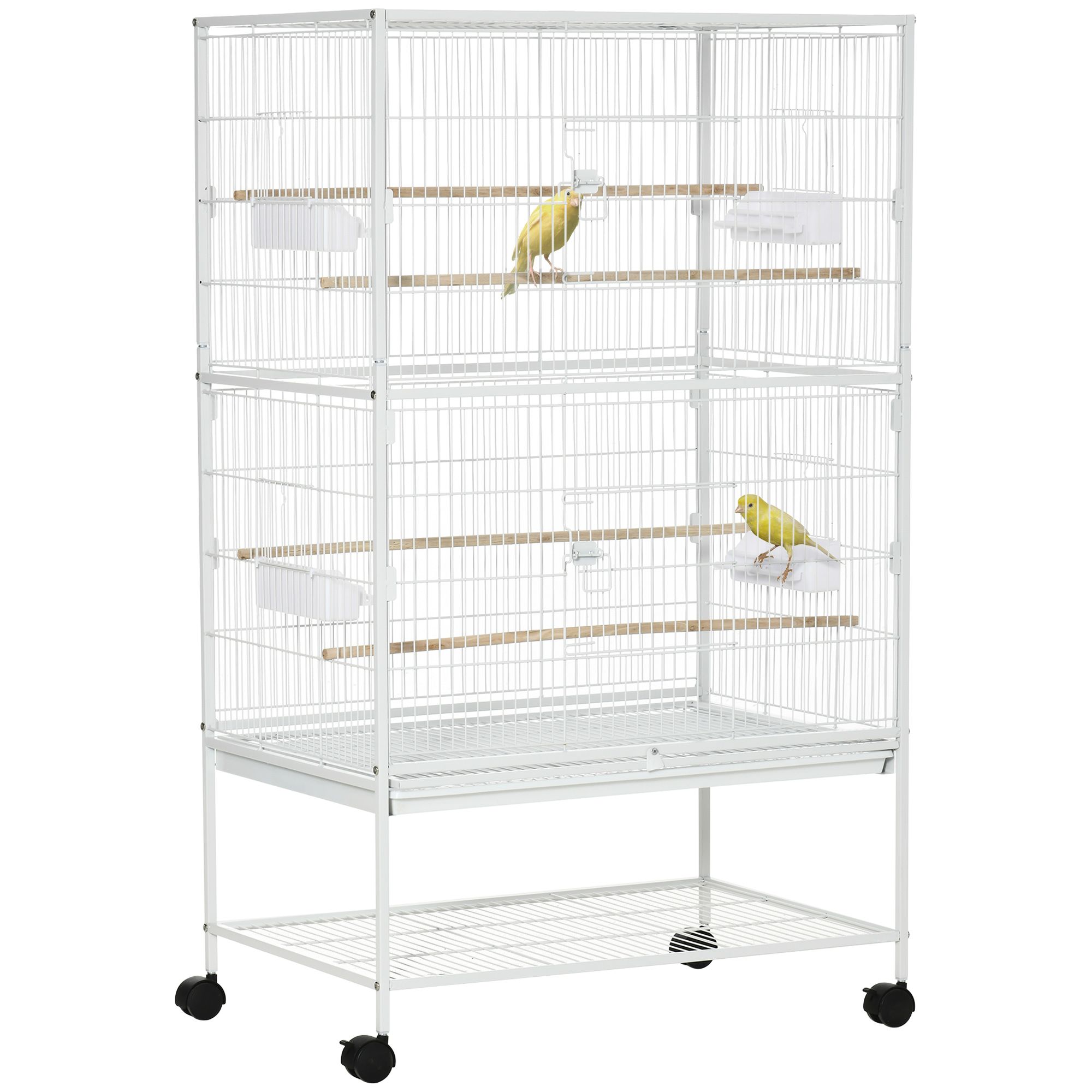 Large Bird Cage Aviary for Finch Canaries, Budgies with Rolling Stand, Slide-out Tray, Storage Shelf, Wood Perch, Food Containers, White