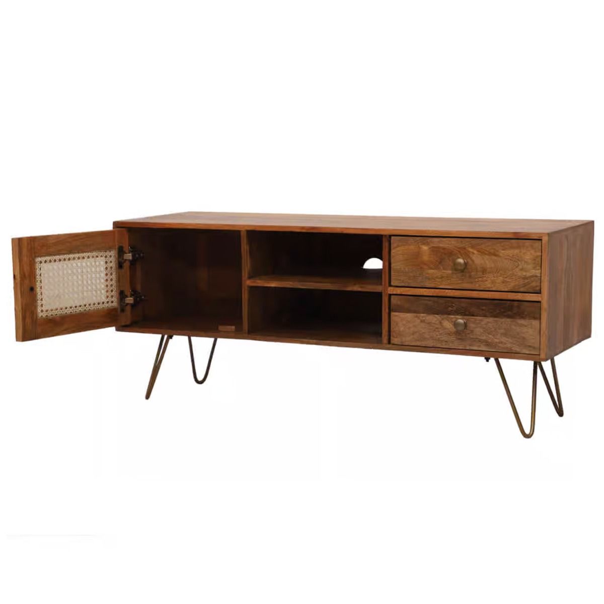 This Mango Wood TV unit 120cm is a handmade, beautiful piece of furniture that will look great in any living room. These mango wood TV cabinets feature 1 door with rattan screen and 2 shelves are perfect for storing all your entertainment needs, while the 2 drawers provide extra space for anything else you need to keep close at hand. Made from mango wood, these Solid Wood TV Units are extremely sturdy and durable, ensuring that it will last for years to come.