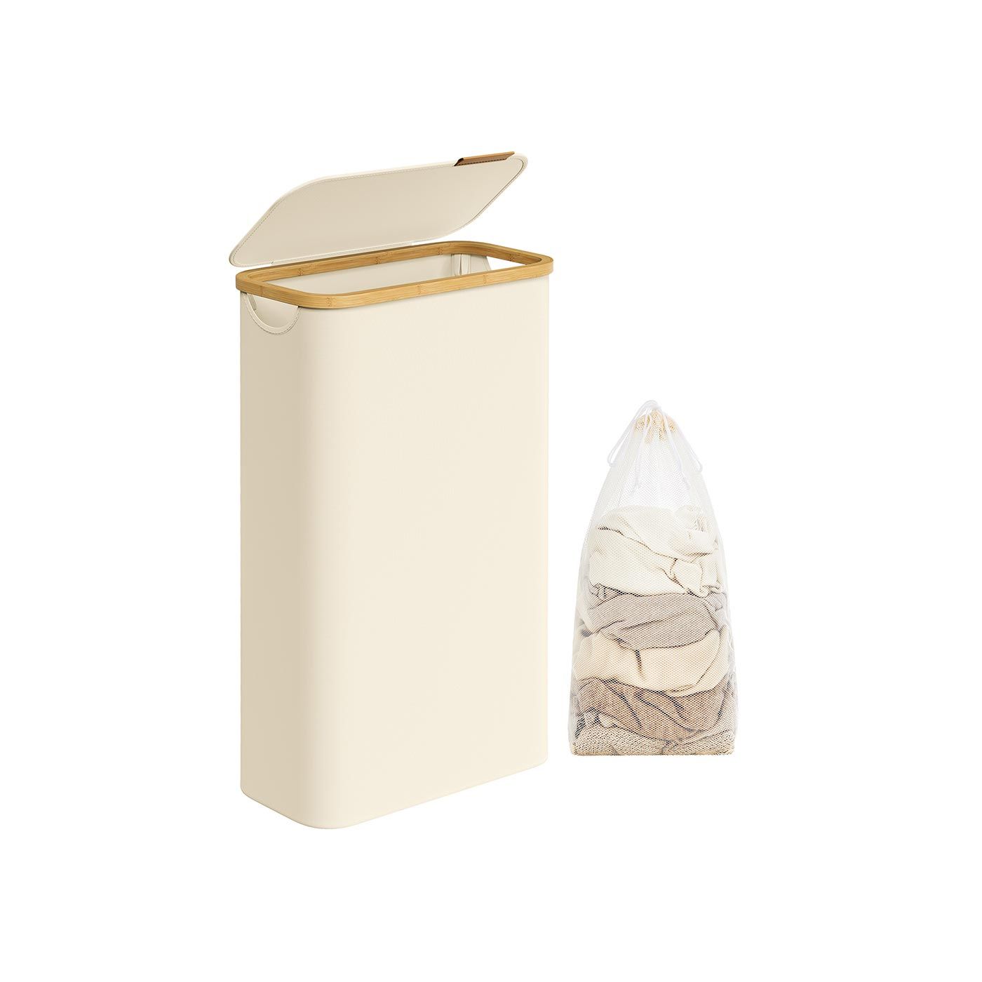 This 65L cream white laundry basket features a lid and a space-saving design (42 x 22.5 x 70.5 cm). Its slim profile makes it ideal for tight spaces. Key features include a removable mesh liner and durable Oxford fabric with stylish bamboo handles. It's collapsible for easy storage when not in use.