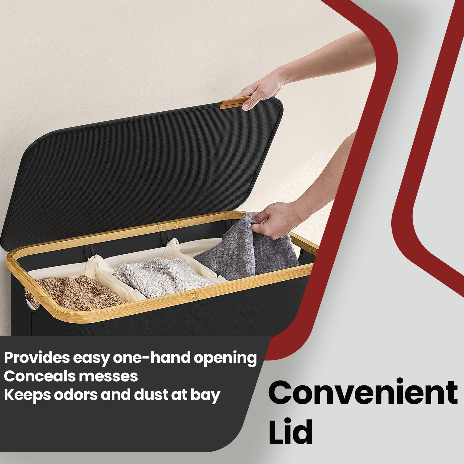 Laundry Basket - VERRA 3-Section Large Hamper with Lid 150L - Black