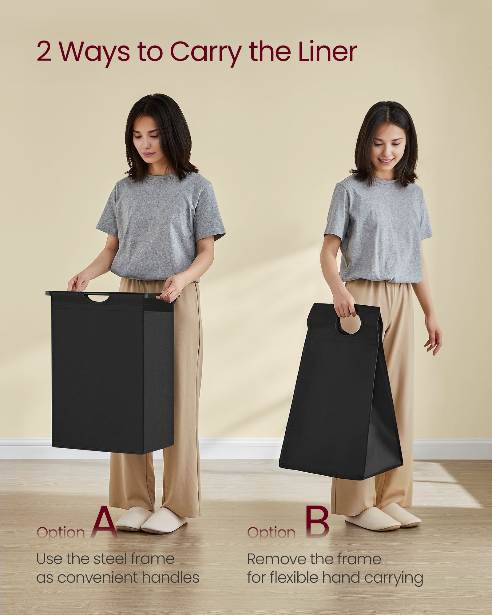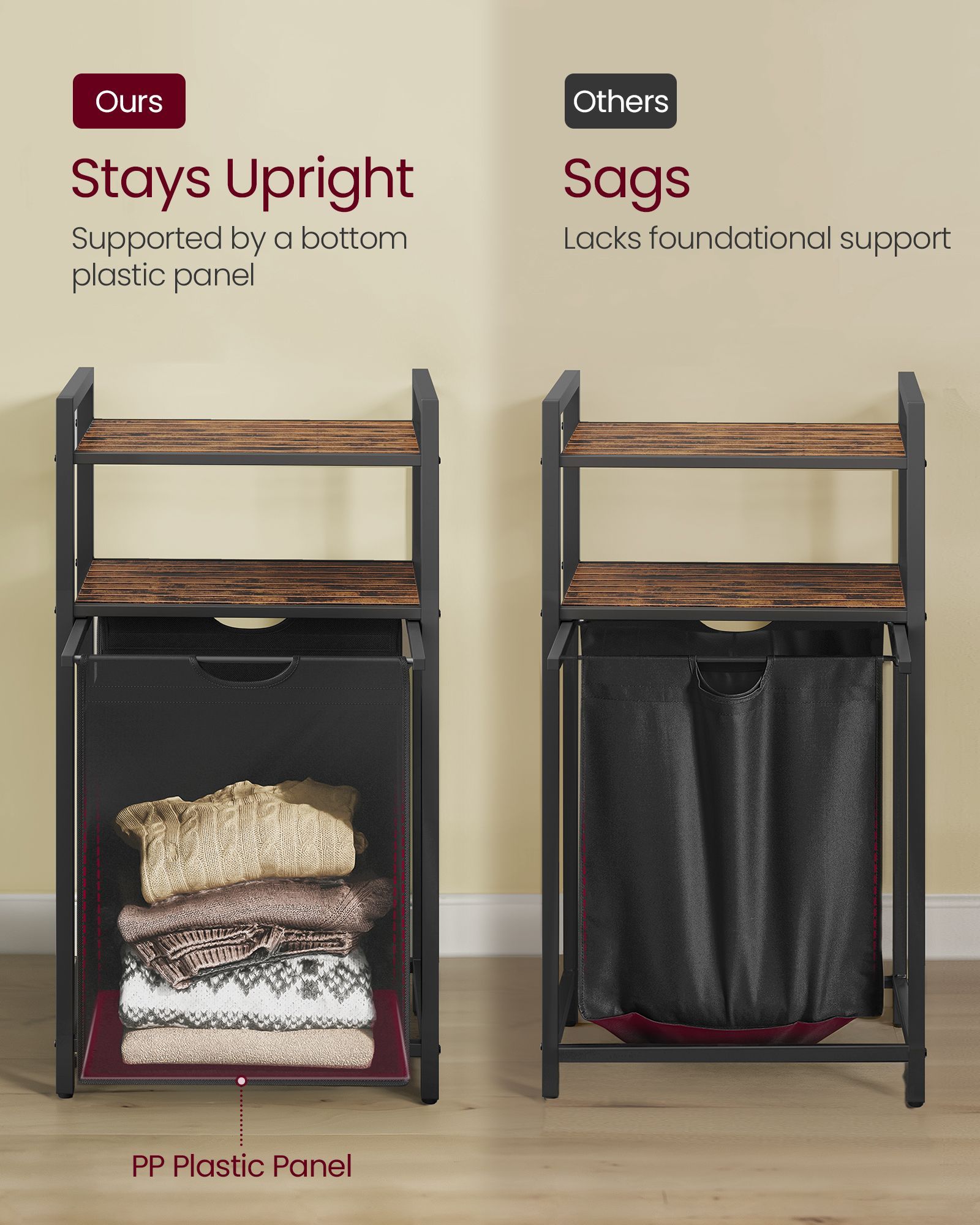 Tired of laundry day clutter? This VASAGLE laundry basket offers a stylish solution! With a generous 65L capacity, its pull-out, removable bag makes transport a breeze. Two convenient shelves provide extra storage for detergents or folded clothes. The rustic brown and black design adds a touch of charm to any laundry room. Simplify your chores with this functional and attractive hamper.