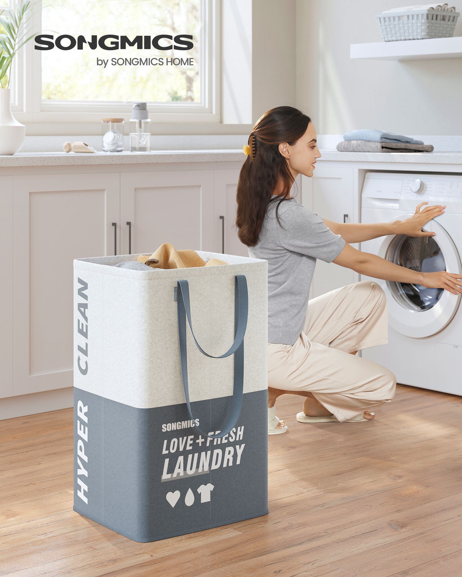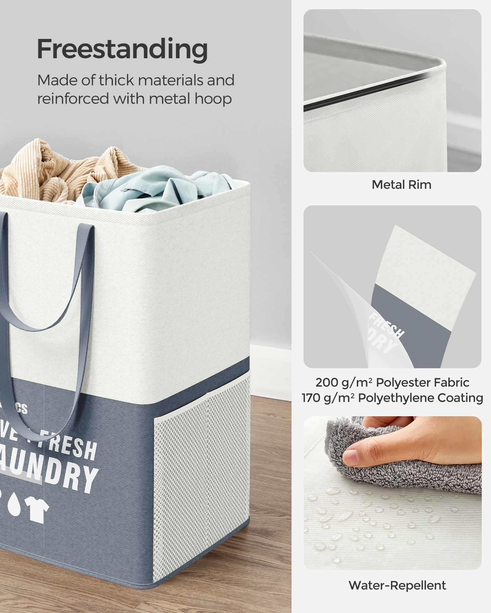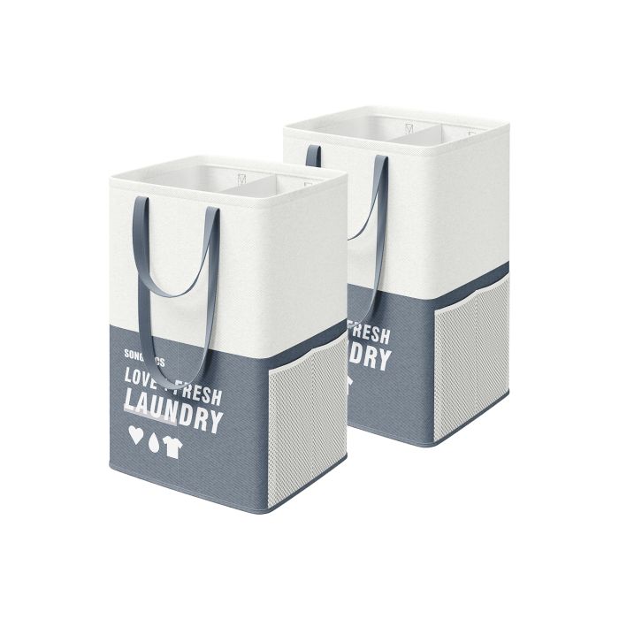 This set of two 90L laundry baskets offers a spacious and convenient solution for your laundry needs. Each large, freestanding hamper features two compartments for easy sorting and is designed to be foldable for compact storage. Durable double handles make transport a breeze, perfect for bedrooms and bathrooms.