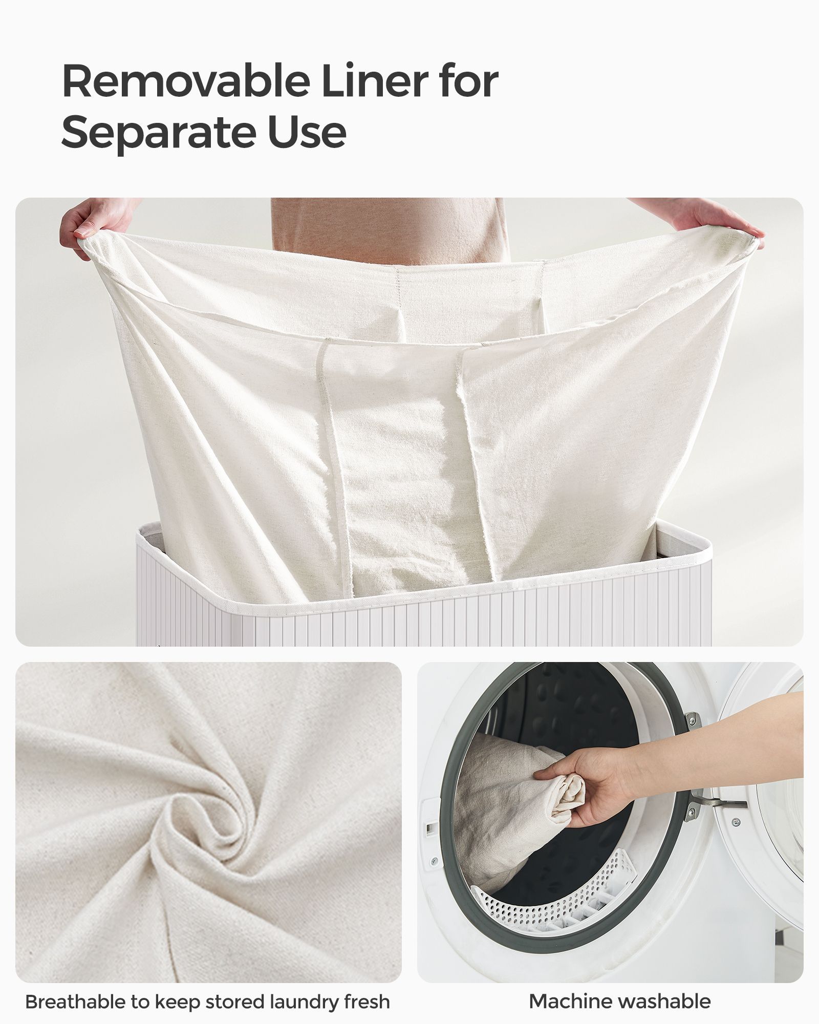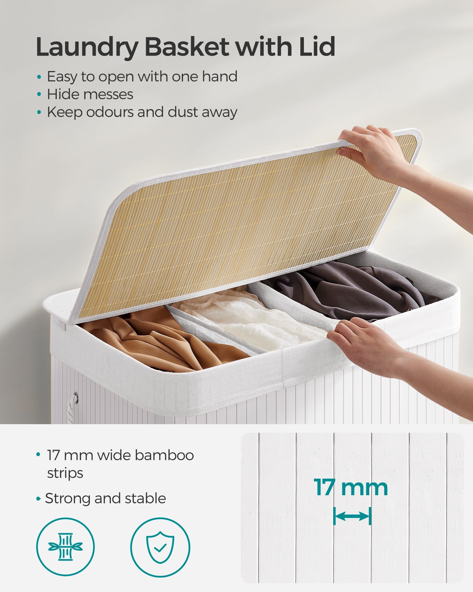 This 150L laundry hamper in Cloud White offers a stylish and practical solution for organizing your laundry. Featuring three distinct sections, it's perfect for sorting clothes by color or fabric type. The convenient clip-on lid keeps contents concealed, while integrated handles ensure easy transport. Its foldable design makes storage a breeze, ideal for any laundry room, bedroom, or bathroom.