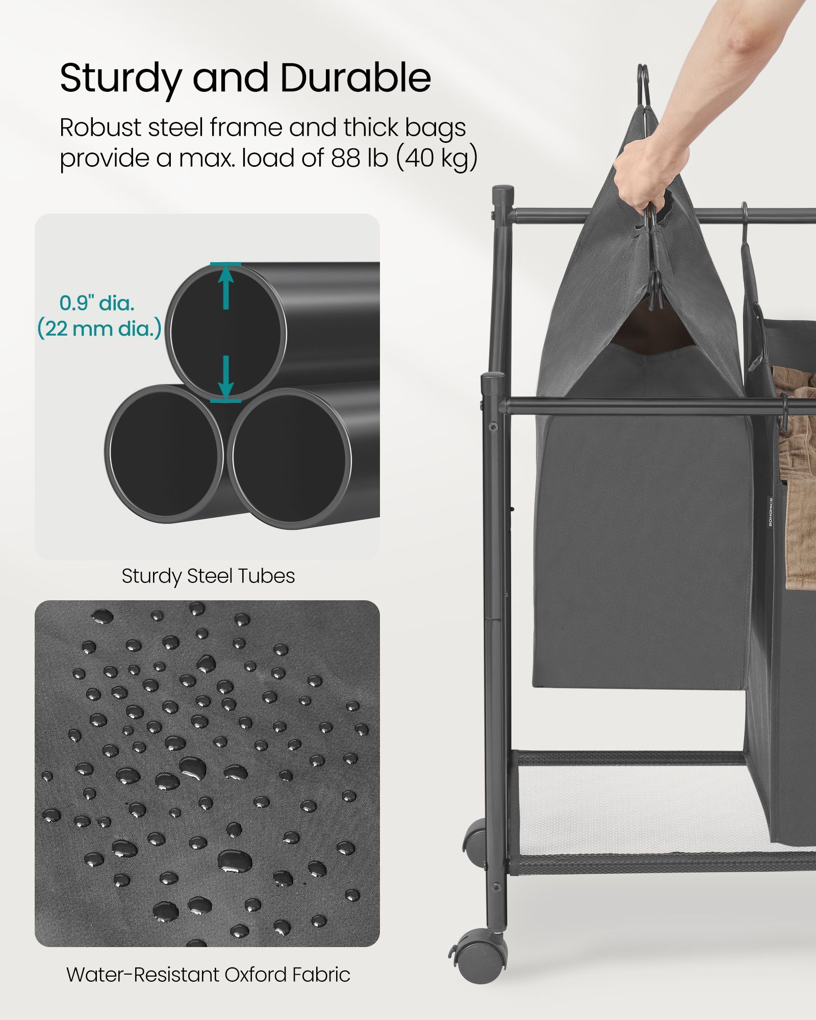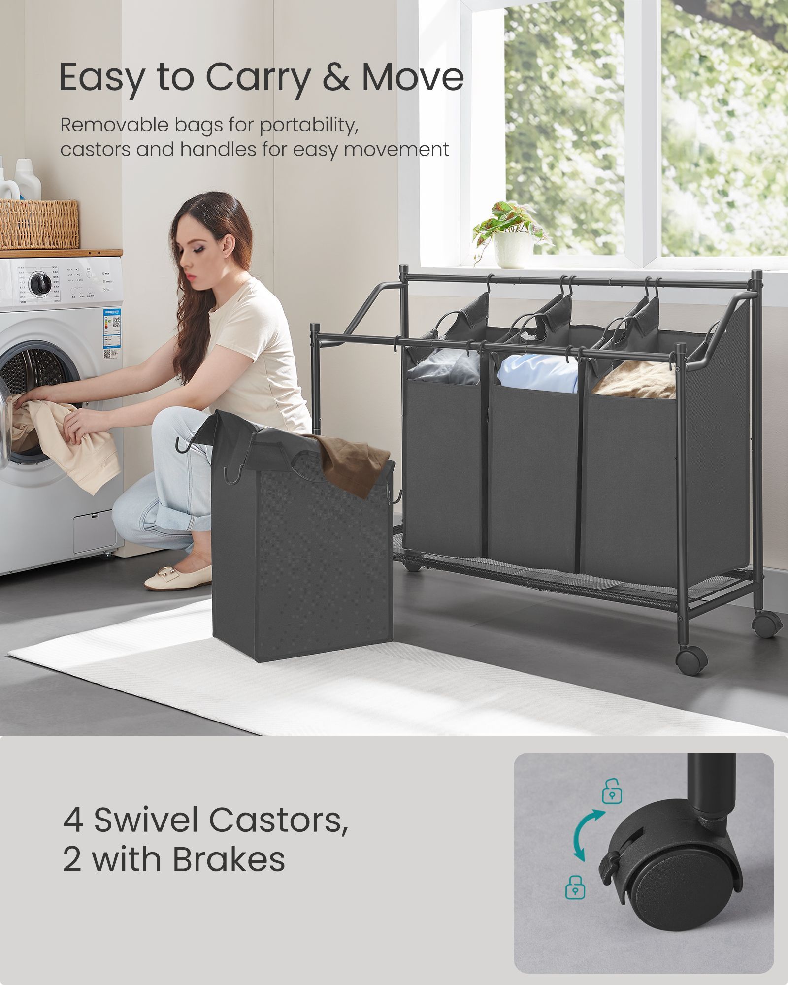 Effortlessly manage your laundry with this sturdy Rolling Laundry Sorter in Slate Grey. Featuring four removable 35L fabric bags, it's perfect for sorting clothes by color or type. The convenient trolley design and smooth-rolling wheels make transporting laundry a breeze. Keep your space tidy and your laundry organized with this practical and stylish collector.