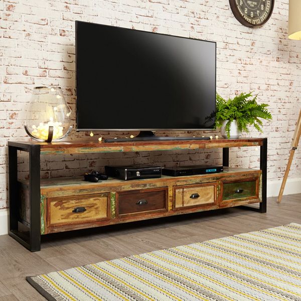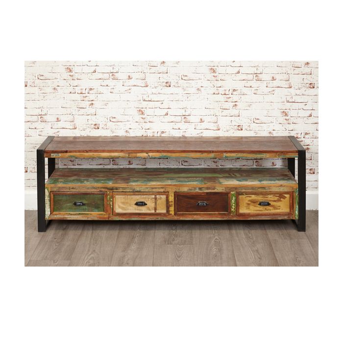 Introducing our stunning Laura Widescreen Television Cabinet, designed to accommodate TVs up to 80 inches with style and functionality. Crafted from reclaimed wood, each piece in our exclusive Laura range is hand-finished to showcase the unique beauty of the timbers, ensuring that no two cabinets are alike. The steel outer frame not only provides exceptional structural support but also adds a contemporary edge to the design, making it a focal point in any living space.