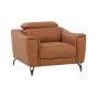 This elegant leather chair is a perfect choice for any living room. All parts that come in contact with skin are made from natural split leather, while the rest is faux leather. Designed for maximum comfort, the chair features a headrest that is adjustable to 6 positions. Wide, deep seats, and easy-care upholstery for easy maintenance and a timeless look and quality. Sleek, metal curved legs add lightness to the bold construction while complementing the beautiful golden-brown shade and a mid-century-inspired form. The armchair is a great way to underline any modern, contemporary, retro or boho interior. Details: Color: Brown. Main material: Leather. Additional material: Plywood, Birch Wood. Weight: 40 Assembly: Legs to be Fitted Weight Capacity: 150 Padding Thickness: 19 Seat Height: 45