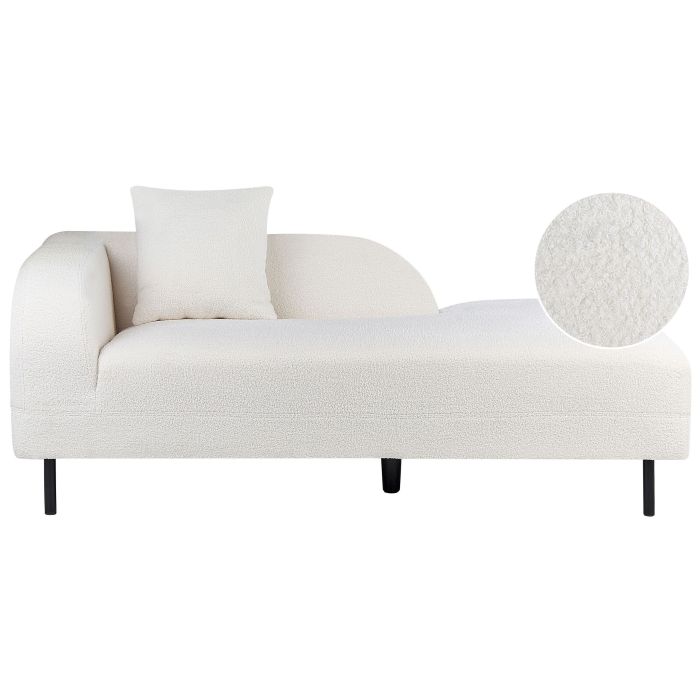 Complement your living space with this utterly elegant chaise lounge. Its simple and smooth shape with a curvy arm and back are reminiscent of a mid-century modern style. Straight, black metal legs make the structure appear lighter. The piece will embellish every modern living room or a large bedroom. Sit back and unwind for a minute in that soft chaise, upholstered with a boucle fabric. Details: Color: White. Main material: Boucle. Additional material: Iron. Material Composition: 100% Polyester Weight: 29 Assembly: Legs to be Fitted Weight Capacity: 300 Cushions Dimensions: 40x40 Legs Height: 17 Padding Thickness: 28 Seat Height: 45