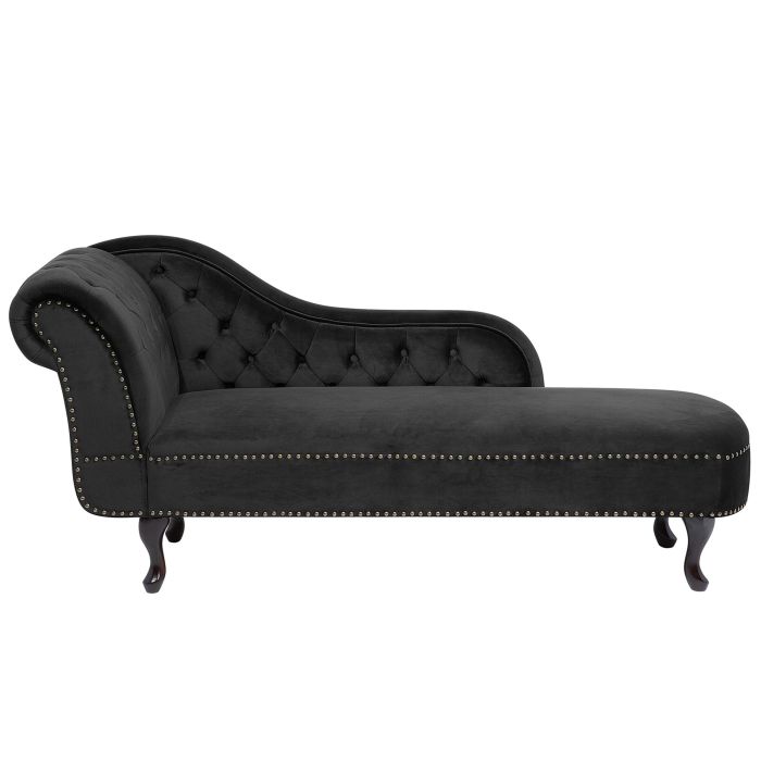 The marvellous chaise lounge is an elegant piece to add to your interior, especially suitable for living rooms and halls. Upholstered with velvet, it is sturdy and pleasant to touch. The chaise lounge is additionally embellished with tufted buttons and nailhead trim. A combination of engineered wood and hardwood make the frame and legs exceptionally durable, warranting great stability and longevity. Details: Color: Black. Main material: Velvet. Additional material: Larch Wood, Plywood. Material Composition: 100% Polyester Weight: 29 Assembly: Full Assembly Required Wood type: Larix gmelinii (Rupr.) Wood Origin: China Weight Capacity: 180 Legs Height: 20 Padding Thickness: 20 Seat Height: 43