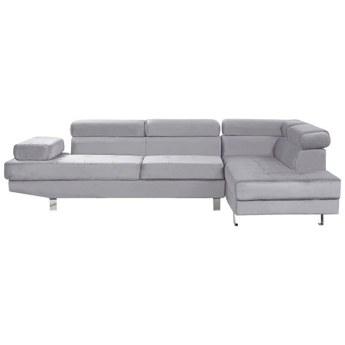 This luxurious yet functional sofa features a chaise placed on the left side from the sitting perspective and adjustable armrests and headrests for comfortable lounging. It is fully upholstered in a glamorous and pleasant to touch velvet in grey colour, and it offers generous seating for 5 people. Firm filling made out of foam and solid wood ensures durability of the product and longevity for many years. The sofa matches with modern or traditional interiors and will enrich them with its attention-drawing design. The additional cushions feature a removable cover that translates to easy cleaning without a worry for stains. Thanks to its metal legs, the whole piece is stable. Details: Color: Grey, Silver. Main material: Velvet. Additional material: Metal, Eucalyptus Wood. Material Composition: 100% Polyester Weight: 89 Capacity: 5 People Assembly: Partial Assembly Required Wood type: Eucalyptus deglupta Wood Origin: China Legs Height: 12 Padding Thickness: 18 Seat Height: 54