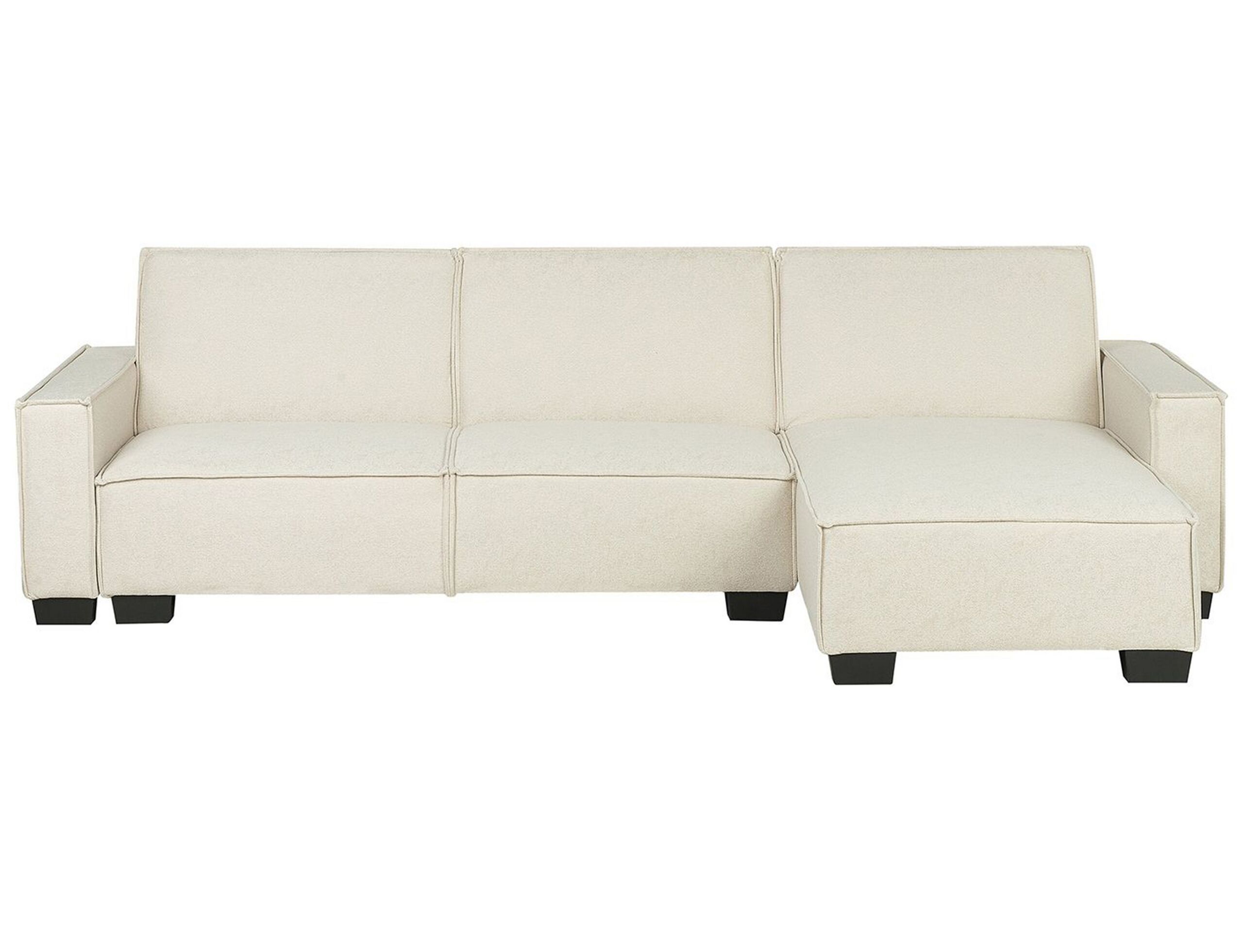 Create a warm and welcoming conversation area with this simply styled classic sofa with its wonderfully plush seating surface. The fully upholstered back and versatile design that allows placing the chaise either on the left or right side, let you arrange your living room in many different ways to create a cosy place to rest during the day. With an easy and quick-to-use click-clack mechanism, you can convert this sofa into a comfortable bed for two and make your friends welcome to stay overnight. Plastic legs ensure that the sofa is stable. Details: Color: Beige, Black. Main material: Polyester. Additional material: Synthetic Material, Eucalyptus Wood. Material Composition: 100% Polyester Weight: 70 Capacity: 3 People Assembly: Partial Assembly Required Legs Height: 8 Seat Height: 41 Sleeping Surface: 253x115
