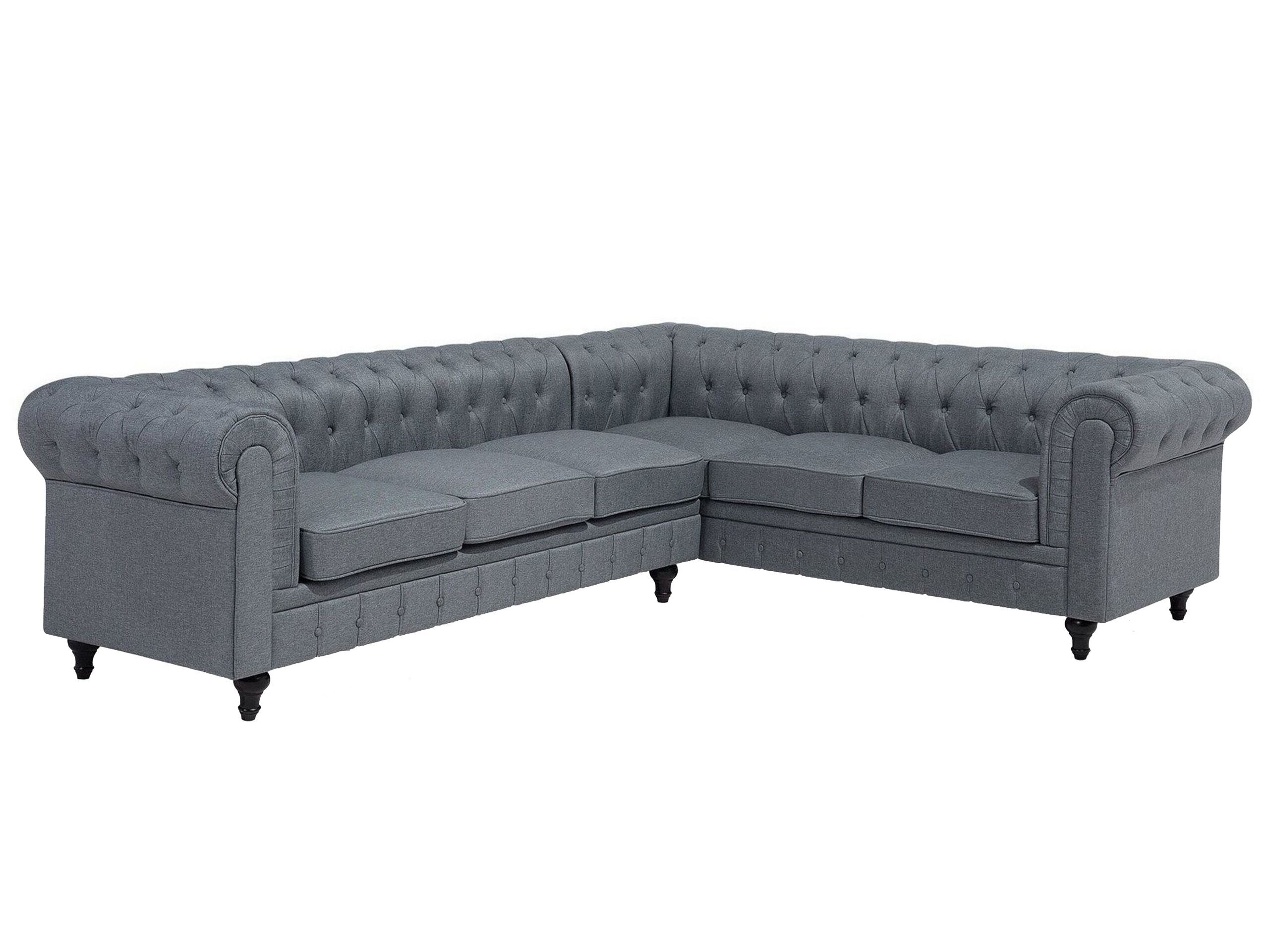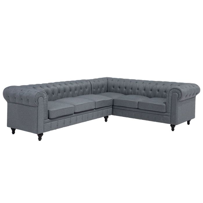 Characterised by a sweeping silhouette with wide scroll arms, this corner comes in an iconic Chesterfield style that suits any modern or traditional interior. The chaise part is situated on the left from the sitting perspective. The low backrest, thickly padded seat cushions as well as ornate eucalyptus wood legs provide the best sitting comfort and stability. The seat cushions feature a removable cover that translates to easy cleaning without a worry for stains. Upholstered in a top-quality fabric in timeless grey, the sofa features classic diamond button tufting. This English classic is easy to care for and looks great with any decor. Details: Color: Grey, Dark Wood. Main material: Polyester. Additional material: Eucalyptus Wood. Material Composition: 100% Polyester Weight: 91 Capacity: 6 People Assembly: Legs to be Fitted Wood type: Eucalypteae Wood Origin: China Legs Height: 13 Padding Thickness: 12 Seat Height: 45