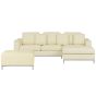 The elegant corner sofa comes in a set with a stylish ottoman. It features a modern design that complements any contemporary interior. The exceptionally long chaise, situated on the left from the perspective of the sitting person, offers ample room for relaxation. The ottoman may be arranged with the sofa creating additional seating space or can serve as a coffee table. All sitting parts are made of genuine leather, while side and front parts are upholstered with durable faux leather. Its stable, chrome-plated legs and add a touch of modern to the classic design. The additional cushions feature a removable cover that translates to easy cleaning without a worry for stains. Details: Color: Beige, Silver. Main material: Leather. Additional material: Metal, Eucalyptus Wood. Weight: 110 Capacity: 5 People Assembly: Partial Assembly Required Wood type: Eucalypteae Wood Origin: China Cushions Dimensions: 40x40 Legs Height: 12 Padding Thickness: 15 Ottoman Dimensions: 95x71x46 Seat Height: 46
