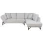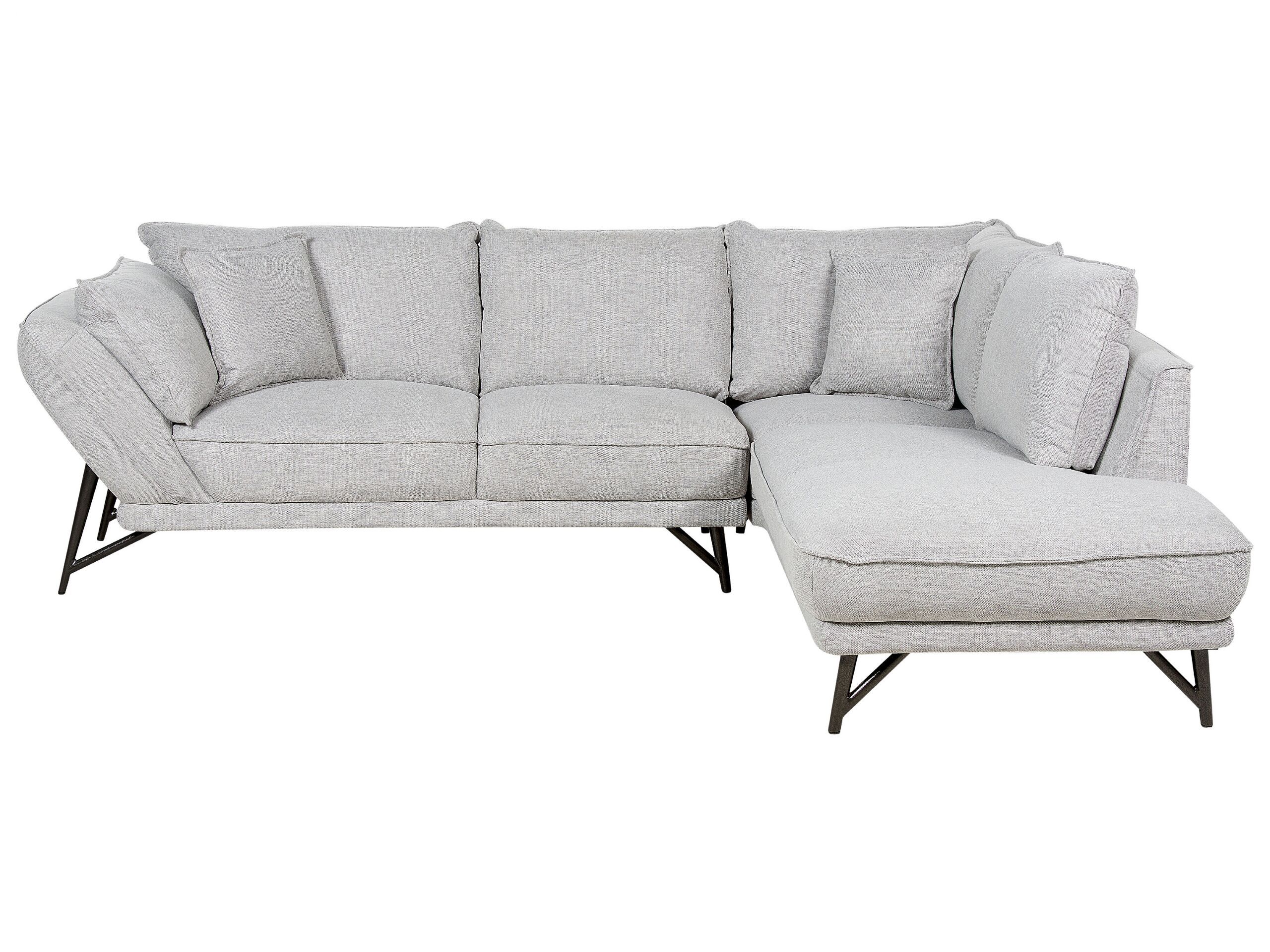 Sink into comfort and enjoy your leisure time on this stylish, upholstered corner sofa. Its modern aesthetic makes it an attention-drawing centrepiece of every living space, and thanks to the linen fabric, it can last for many years, even without daily care. Extra toss pillows, and scatter back, comprised of large cushions, offer great comfort, while black, metal legs guarantee stability, whether you sit or lie down. Details: Color: Grey, Black. Main material: Linen. Additional material: Eucalyptus Wood, Plywood, Steel. Material Composition: 100% Linen Weight: 100 Capacity: 3 People Assembly: Full Assembly Required Wood type: Eucalyptus grandis Wood Origin: China Cushions Dimensions: 45x69/45x64/45x65/36x36 Legs Height: 18 Padding Thickness: 19 Seat Height: 43