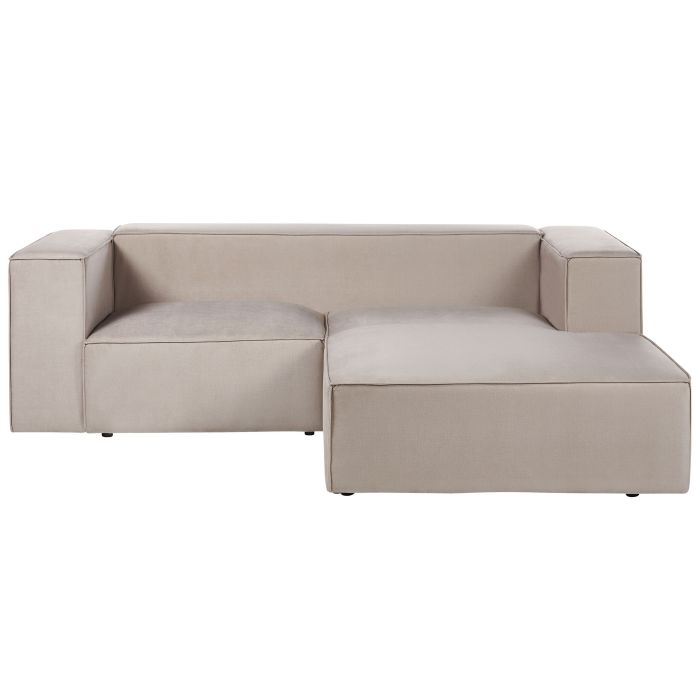 A timeless, taupe beige two-seater corner sofa that's just right for a small or medium-sized living room. It's designed with a chaise, making it cosy and comfortable for relaxation, allowing you to stretch out on its longer section. The low backrest and clean lines give the sofa a minimalist and stylish shape, blending seamlessly into a modern living space. Details: Color: Beige. Main material: Velvet. Additional material: Synthetic Material. Material Composition: 100% Polyester Weight: 87 Capacity: 2 People Assembly: Partial Assembly Required Wood type: Eucalyptus grandis Wood Origin: China Legs Height: 3 Seat Height: 41