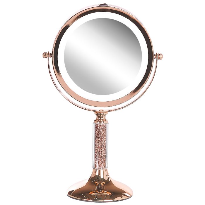 Upgrade your bathroom or your dressing table with this practical make-up mirror. Its modern design makes it a superb addition to any space. The robust iron frame boasts a glossy finish which beautifully highlights the embellished base, showcasing its elegant design. You can easily switch between the standard and the five-times magnifying side thanks to the featured swivel mechanism. The piece comes with an inbuilt LED light for utter convenience. Details: Color: Rose Gold. Main material: Iron. Weight: 1 Assembly: Does Not Require Assembly