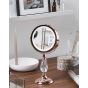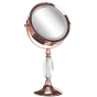 This classic make-up mirror with subtle embellishments is a perfect addition to any dressing table. Its classic frame is made from durable iron, which boasts a glossy finish for a modern look. The piece is double-sided, so apart from the standard reflection, you can use the 5 times magnified one whenever in need. Additionally, the mirror features LED light for utmost convenience. Details: Color: Rose Gold. Main material: Iron. Weight: 1 Assembly: Does Not Require Assembly