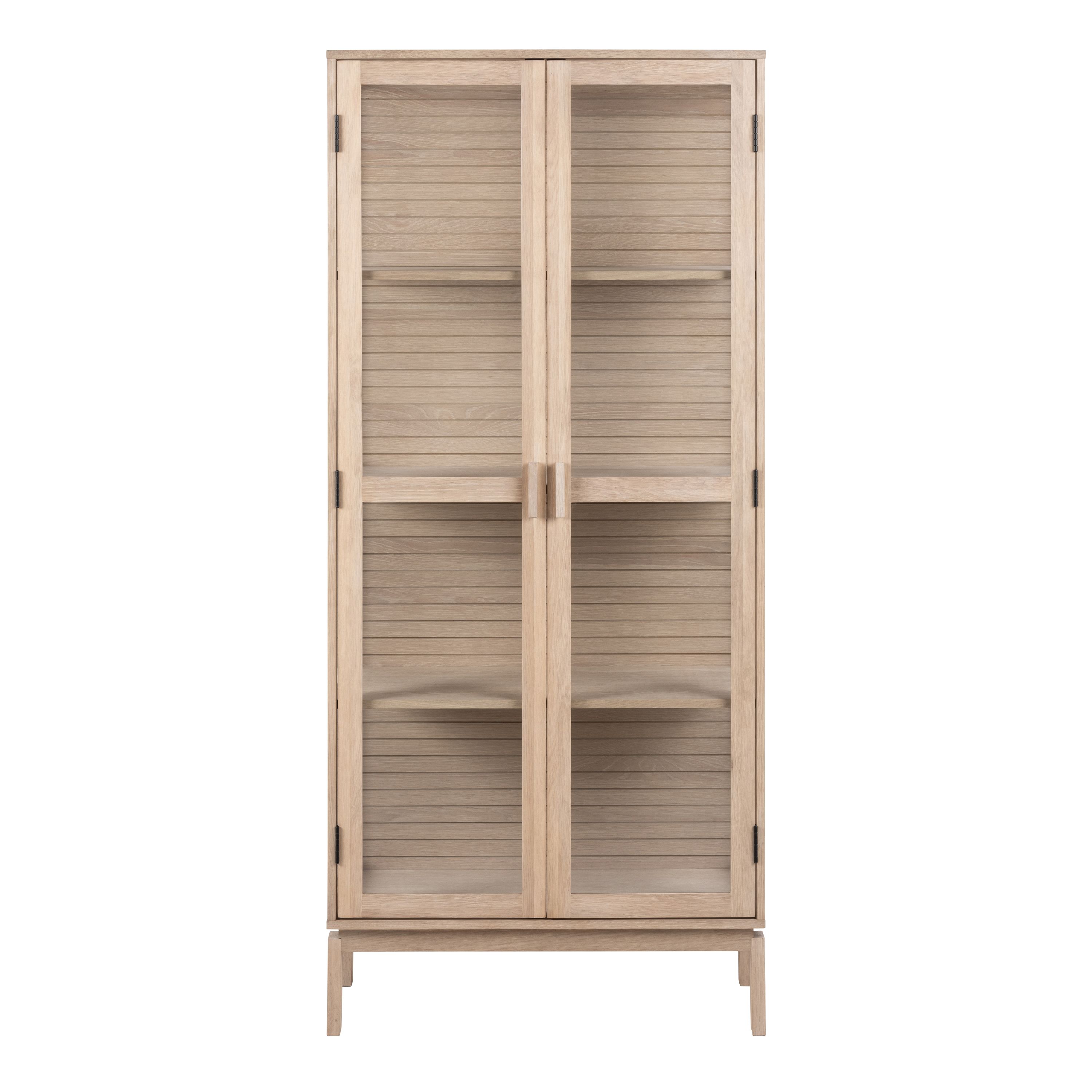 Showcase your treasures in style with this elegant display cabinet. The white pigmented oiled oak effect and clear tempered glass doors are beautifully accented by a lamella back, creating a stunning backdrop for your displayed items.