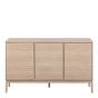 Refine your living space with our sleek sideboard, featuring a clean white pigmented oiled oak effect. The design includes three doors and shelves for ample storage, complemented by a lamella design and a seamless push-to-open function for a modern aesthetic.
