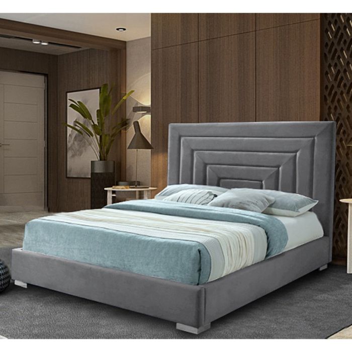 Take your bedroom space to a whole new modern level with this amazing bed. Geometric design that is nothing short of spectacular. A squared design giving that modern look, this bed is sure to give your room the contemporary and vibrant profile. Quality solid straight slats improve comfort and mattress lifespan. This slats are manufactured with a solid construction for superb durability. Metal chrome feet to finish off this stunning bed