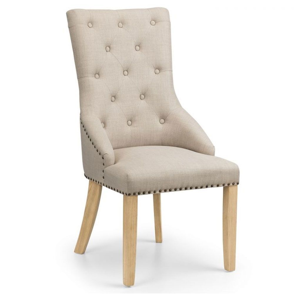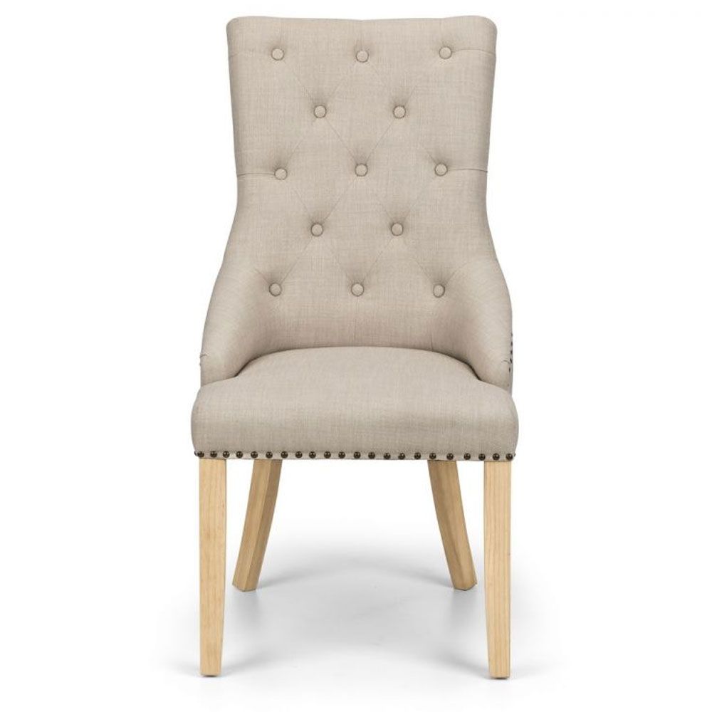 Upholstered in a luxurious oatmeal linen fabric, the Loire Button Back chair features elegant deep buttoning and a metal stud trim.