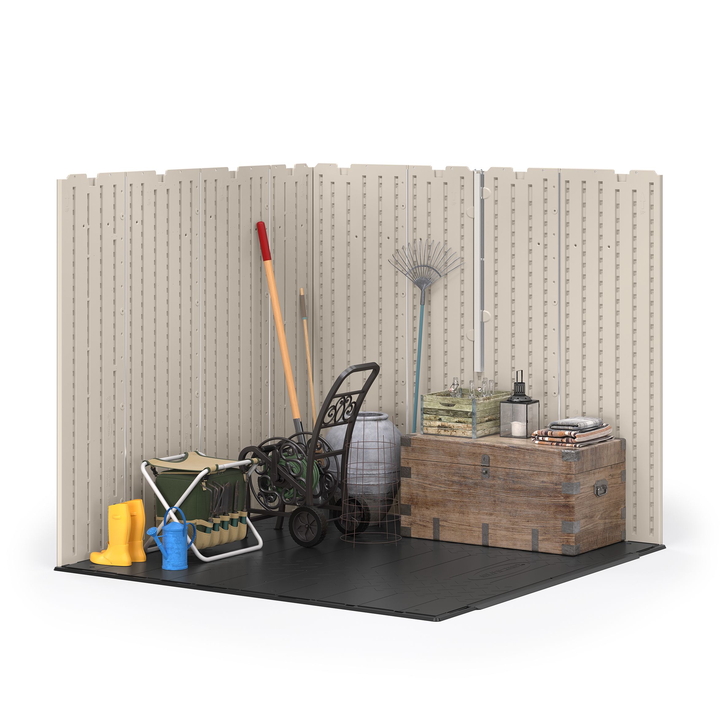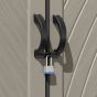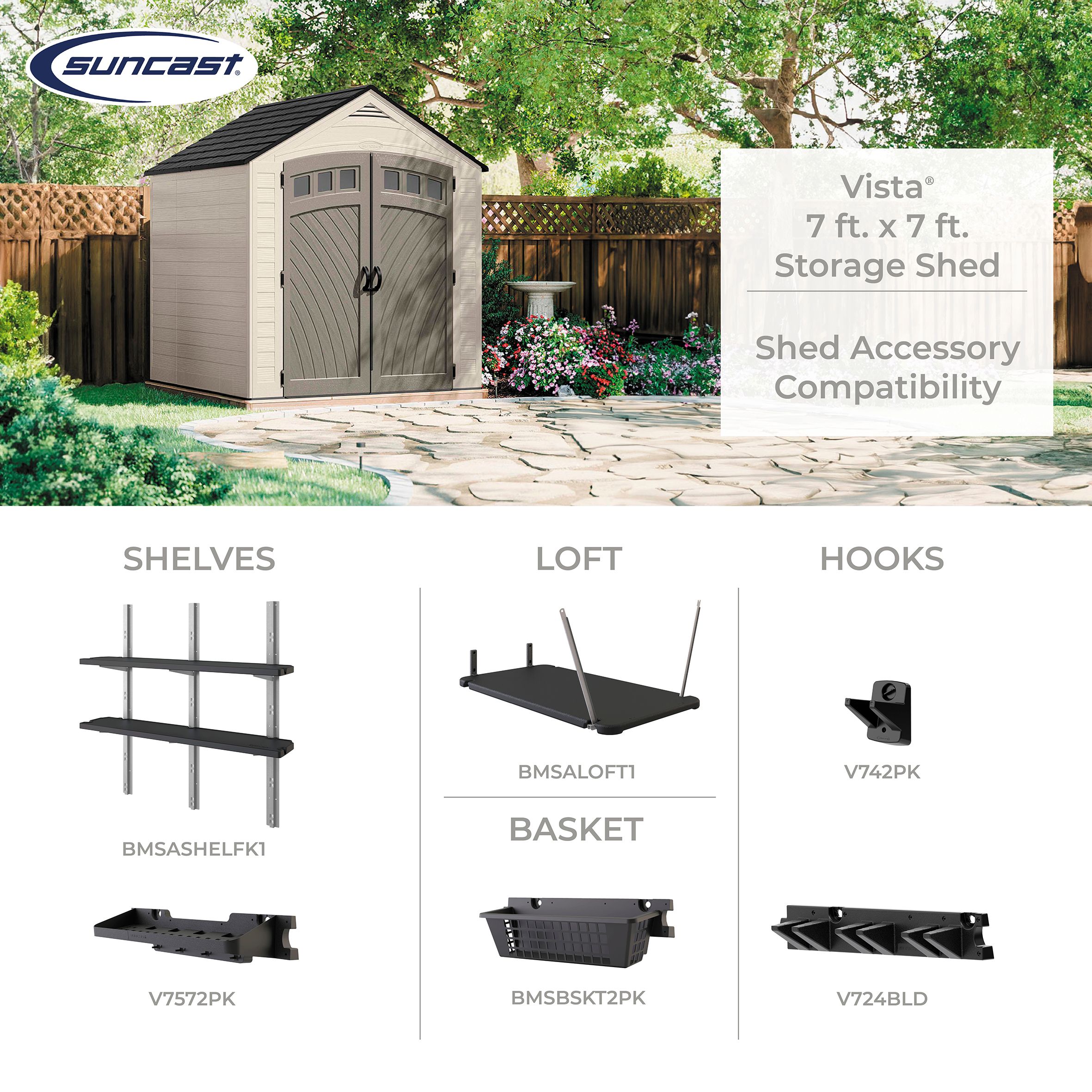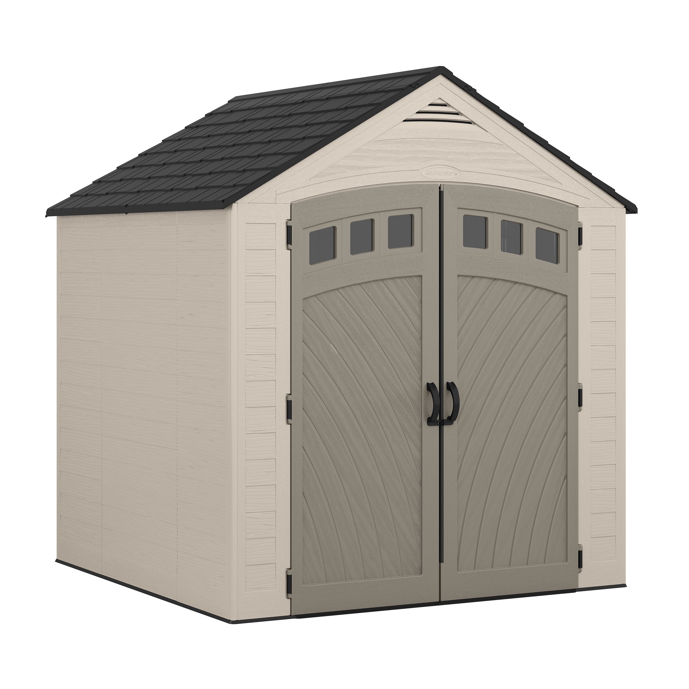 Finding the perfect storage solution for your garden is simpler than you may think with the Suncast 7 ft. x 7 ft. LORNVALE Storage Shed. This roomy shed has plenty of space to accommodate all your gardening tools, bicycles, lawn mower, and other outdoor equipment. The double doors with metal hinges allow you to access your items easily and are pad-lockable to keep your contents safe and secure (lock not included). The metal-reinforced, multi-wall resin panel construction provides added strength and stability allowing it to withstand the elements and look great in your garden all year long.