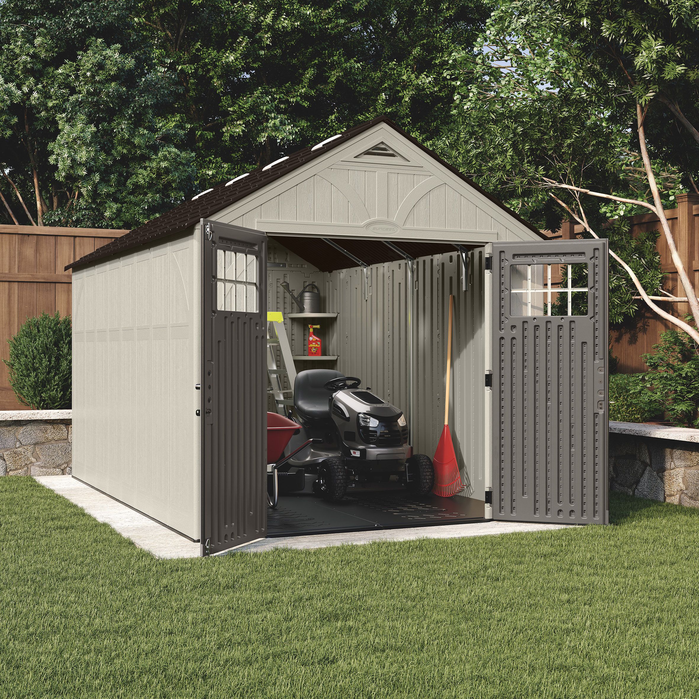 Having enough storage space can be a problem, let the LORNVALE 8 ft. x 13 ft. Storage Shed by Suncast be the solution. This large shed provides a generous 20m3 of storage space and is ideal for storing lawn mowers, motorcycles and all of your large outdoor equipment. Utilise the 4 included corner shelves for additional storage and organisation. Eight built-in skylights provide natural light making it easier to locate items during the daytime. Large double doors allow you to move and store your belongings with ease and are padlock compatible for added security (lock not included). Constructed of metal reinforced, multi-wall resin panels, this sturdy shed is weather-resistant and easy to maintain from season to season.
