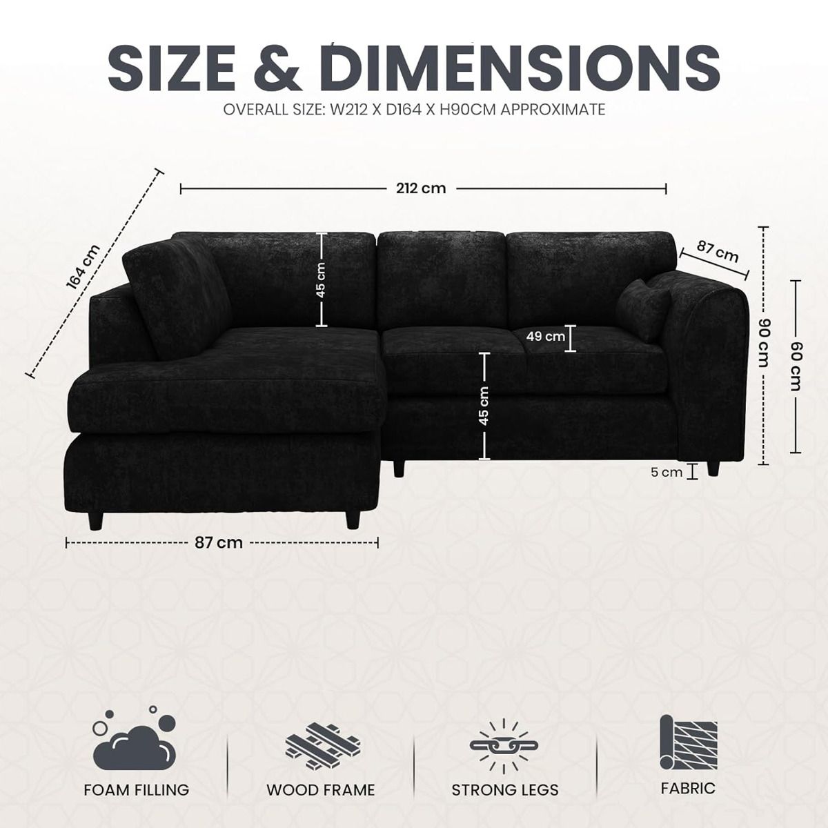 LORVANI Fabric 4 Seater L Shaped Fullback Corner Sofa - Black, Left Hand Facing