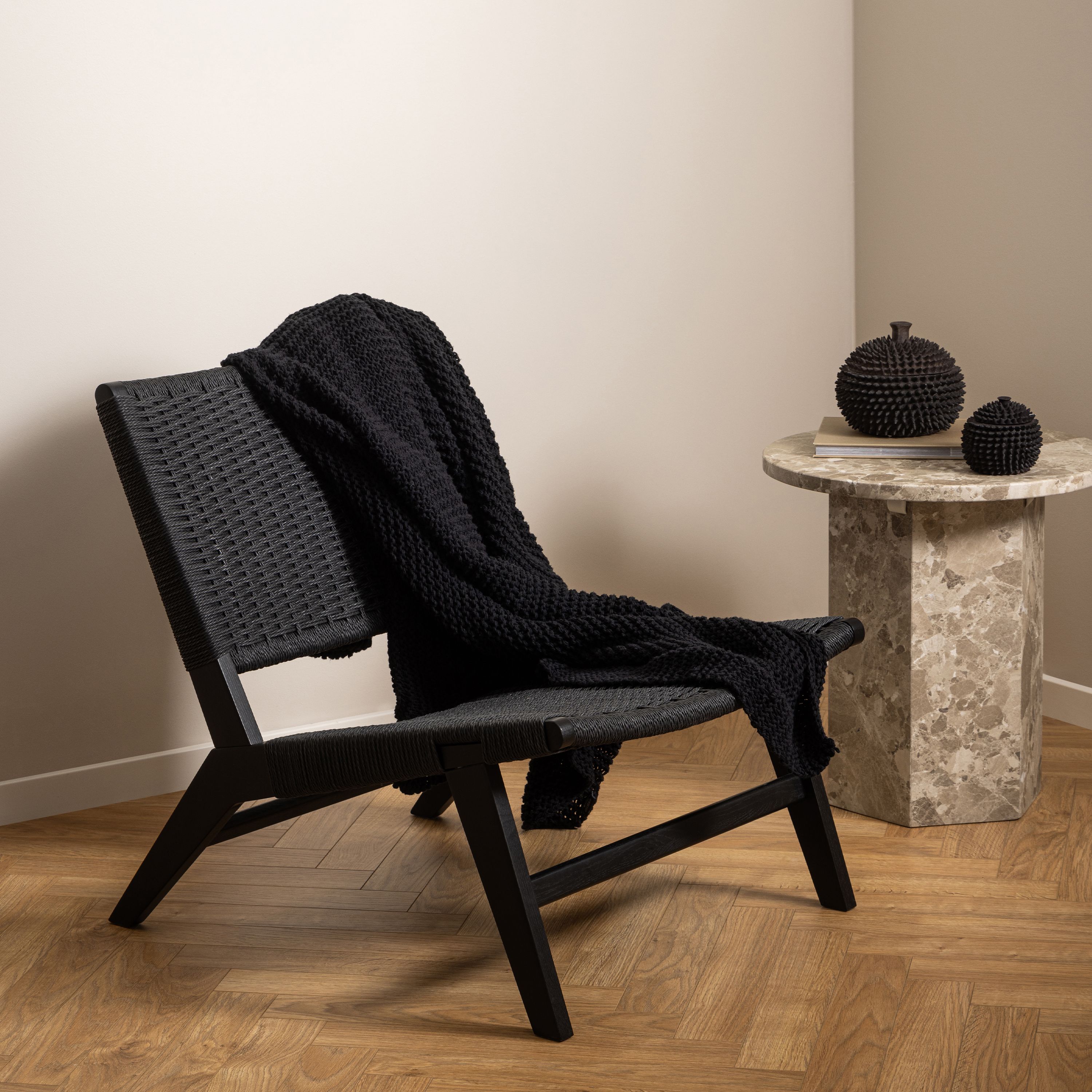 Stylish Nordic lounge chair with black lacquered oak frame and woven paper plaits. Minimalistic design, perfect for quiet contemplation or as a timeless centerpiece.