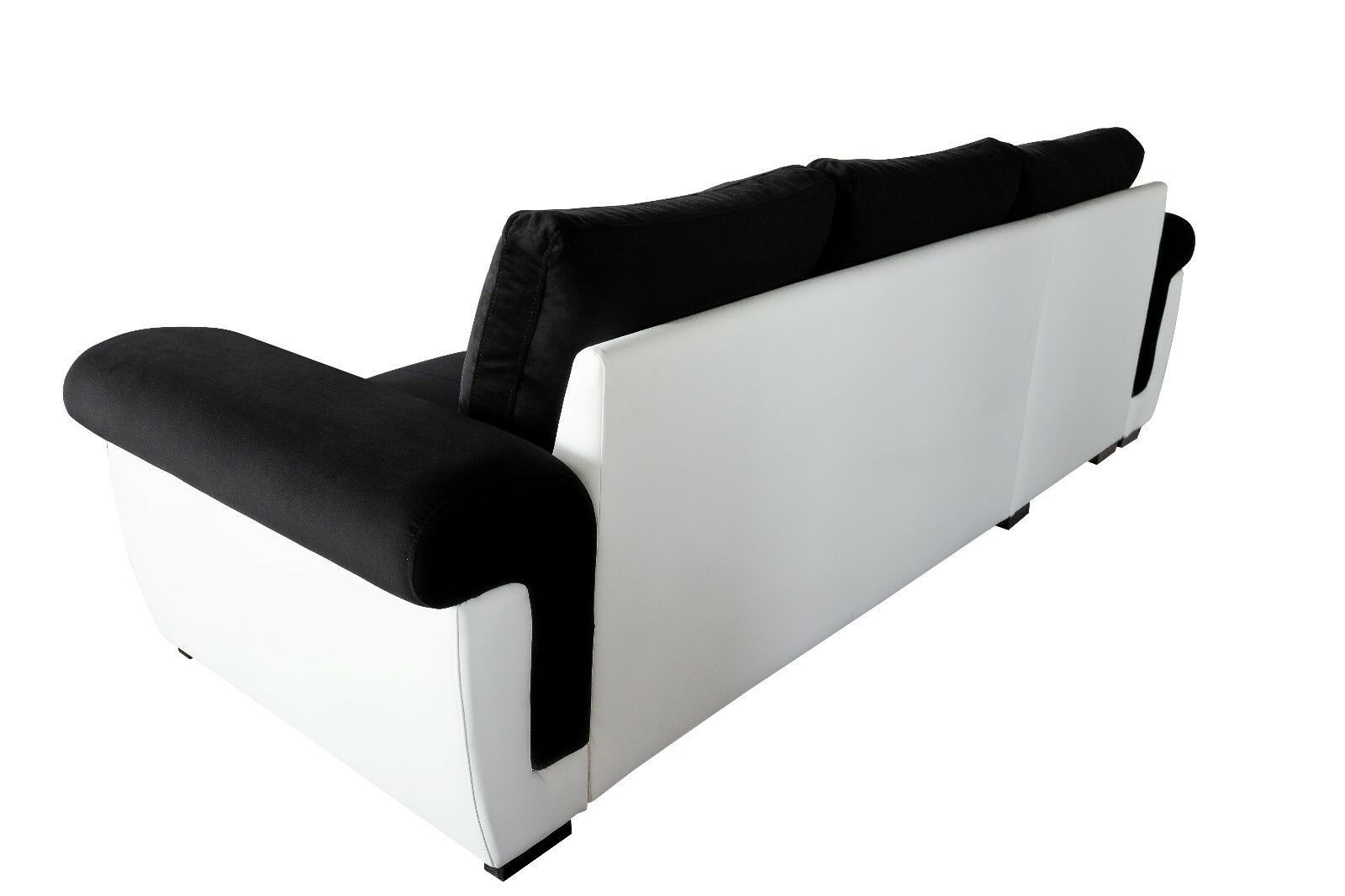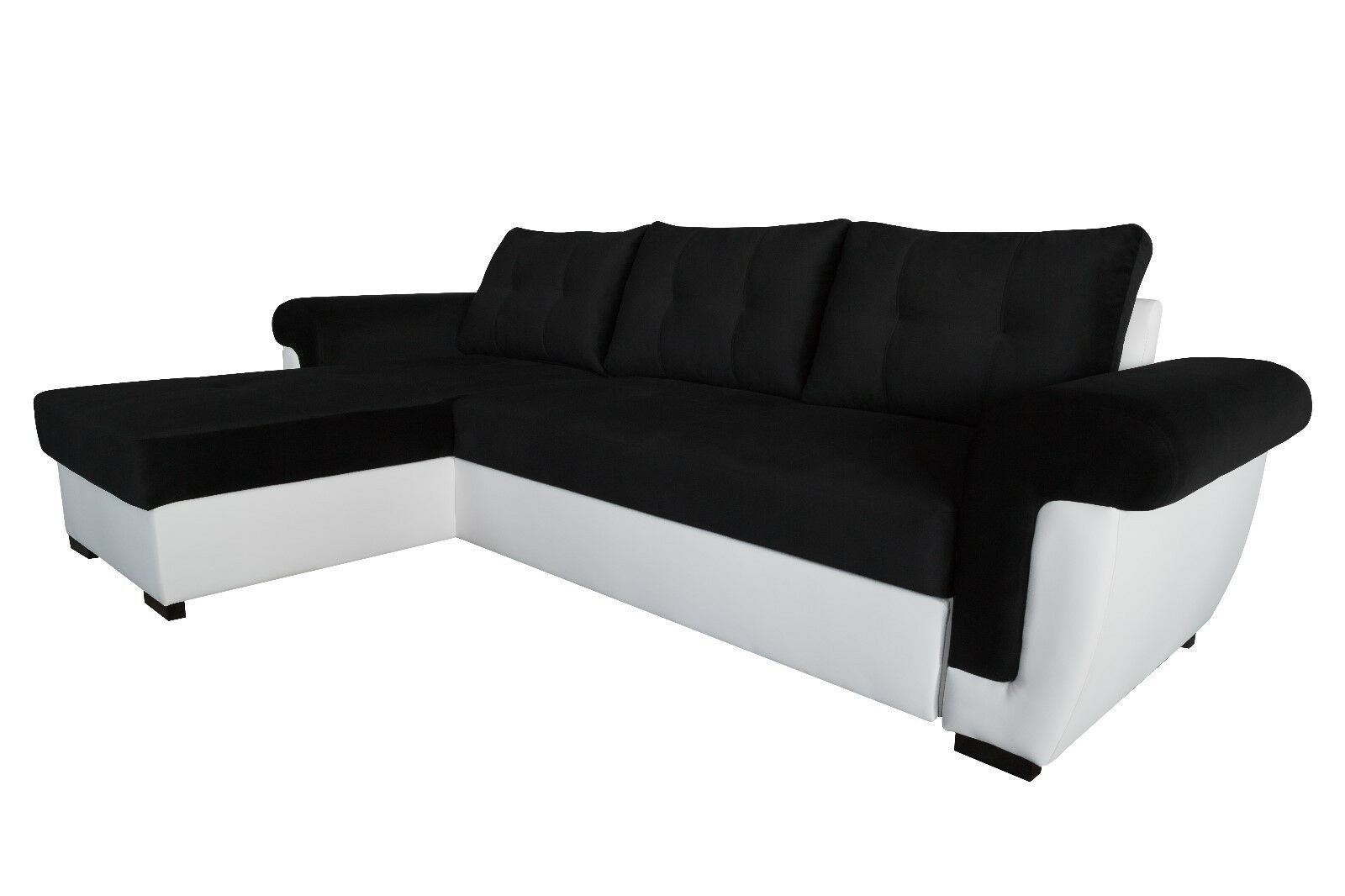Transform your living space with this versatile corner sofa bed in black fabric and white faux leather. Designed for style and comfort, it features a universal left or right chaise configuration, a spacious pull-out large double bed, and firm high-density foam cushions for lasting support.