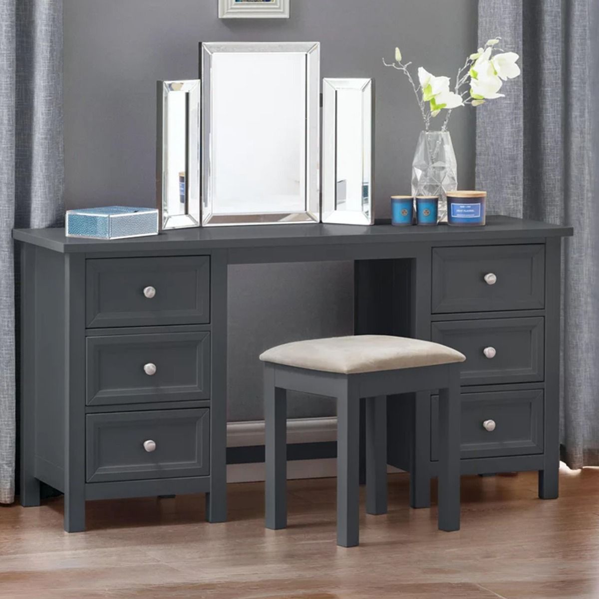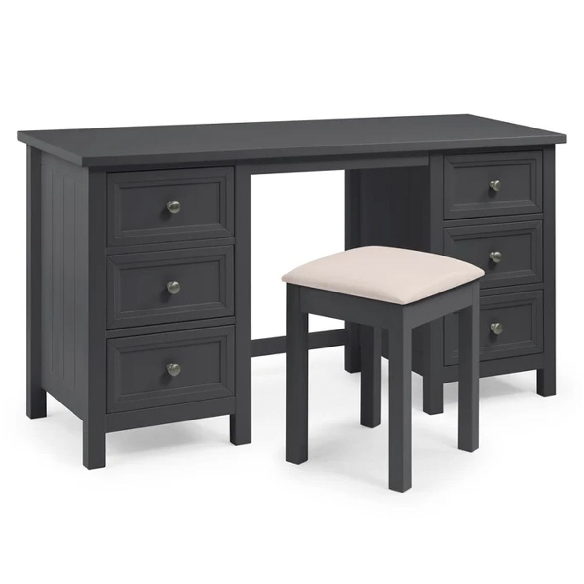 Maine is an elegant New England style range of bedroom furniture. The combination of exquisite Anthracite lacquered finish with characteristic side panelling and detailed chamfered cabinetry makes for a soothing and refined aesthetic with timeless appeal, while delicate pewter handles add the perfect finishing touch. The Maine Dressing Stool has an upholstered padded seat, the perfect match for the Maine Dressing Table.