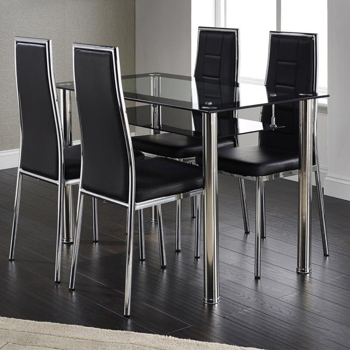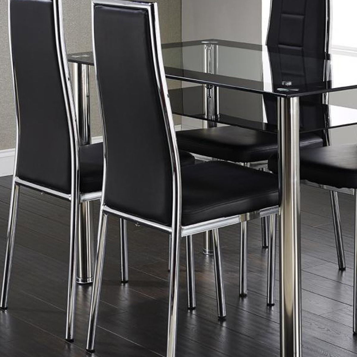 - A complete dining set that includes a rectangular glass table with a black border and four matching PU chrome chairs in black.