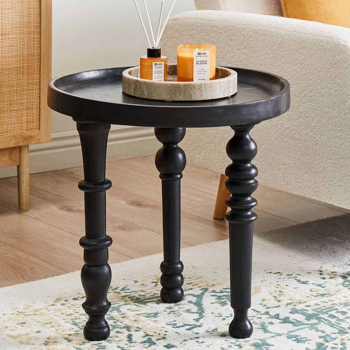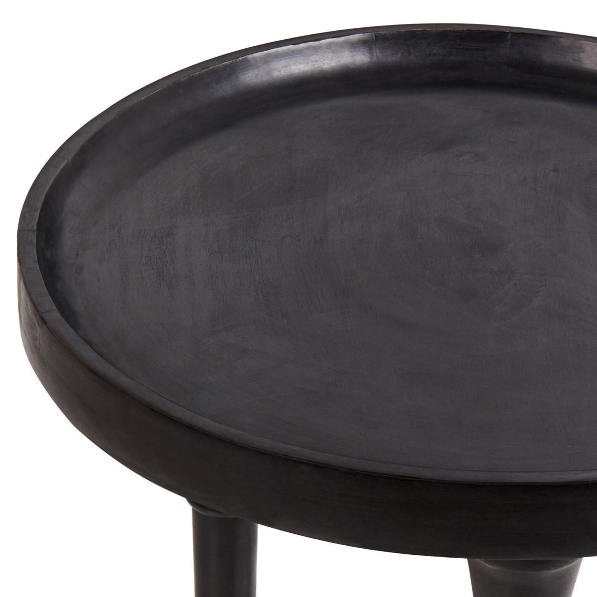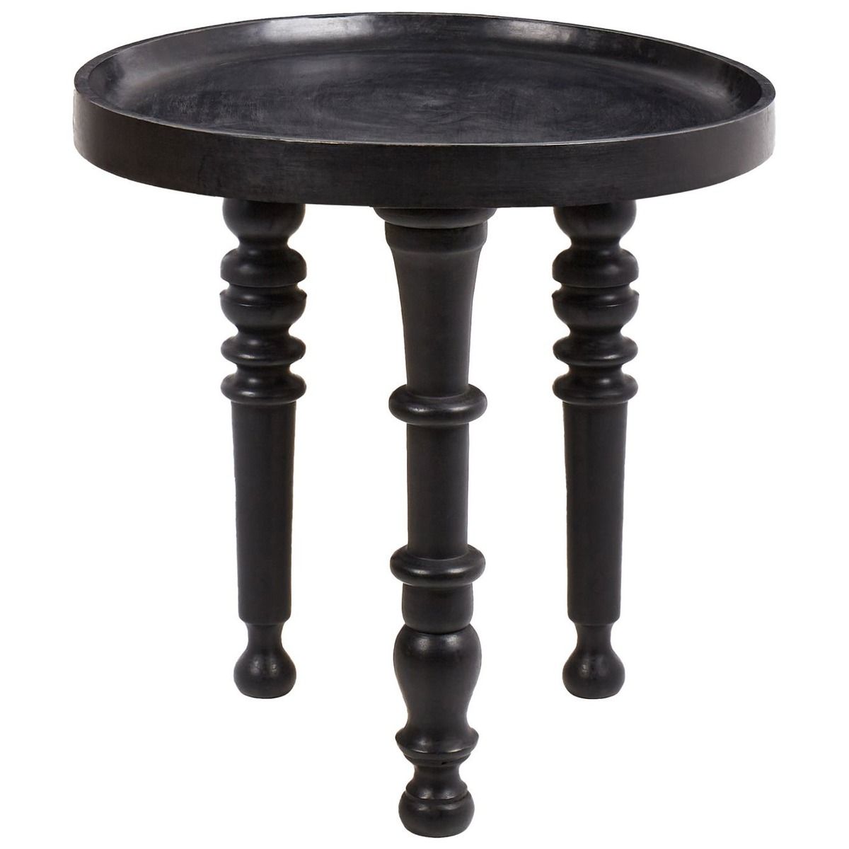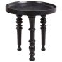 This striking side table, crafted from solid mango wood, boasts a bold black finish that adds sophistication and elegance to any space. The beautifully turned legs bring a timeless, traditional feel, while the raised edge of the round tabletop ensures practicality for displaying decorative items or serving drinks. Perfect for both contemporary and classic interiors, this table offers a stylish and functional accent to your living room or lounge area.