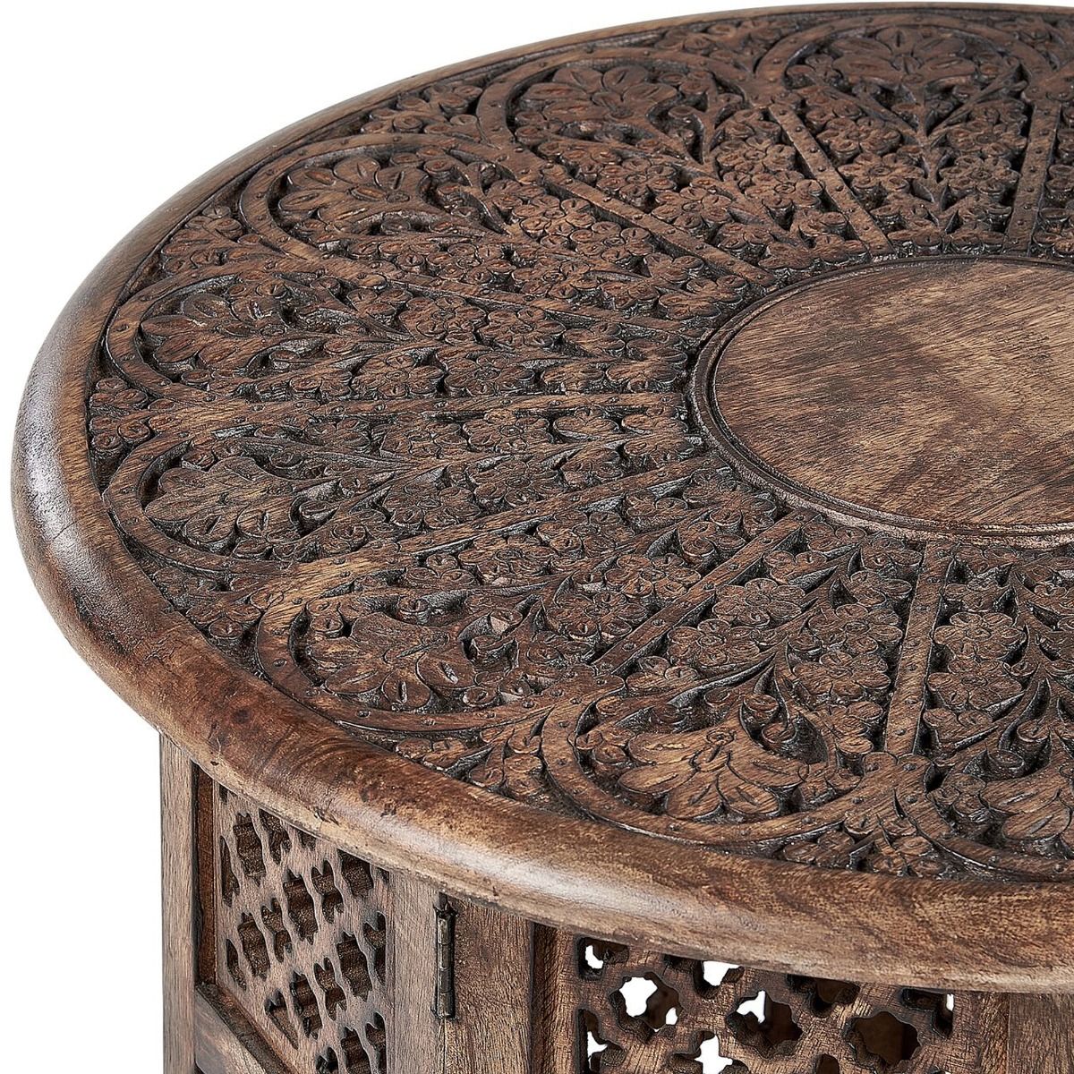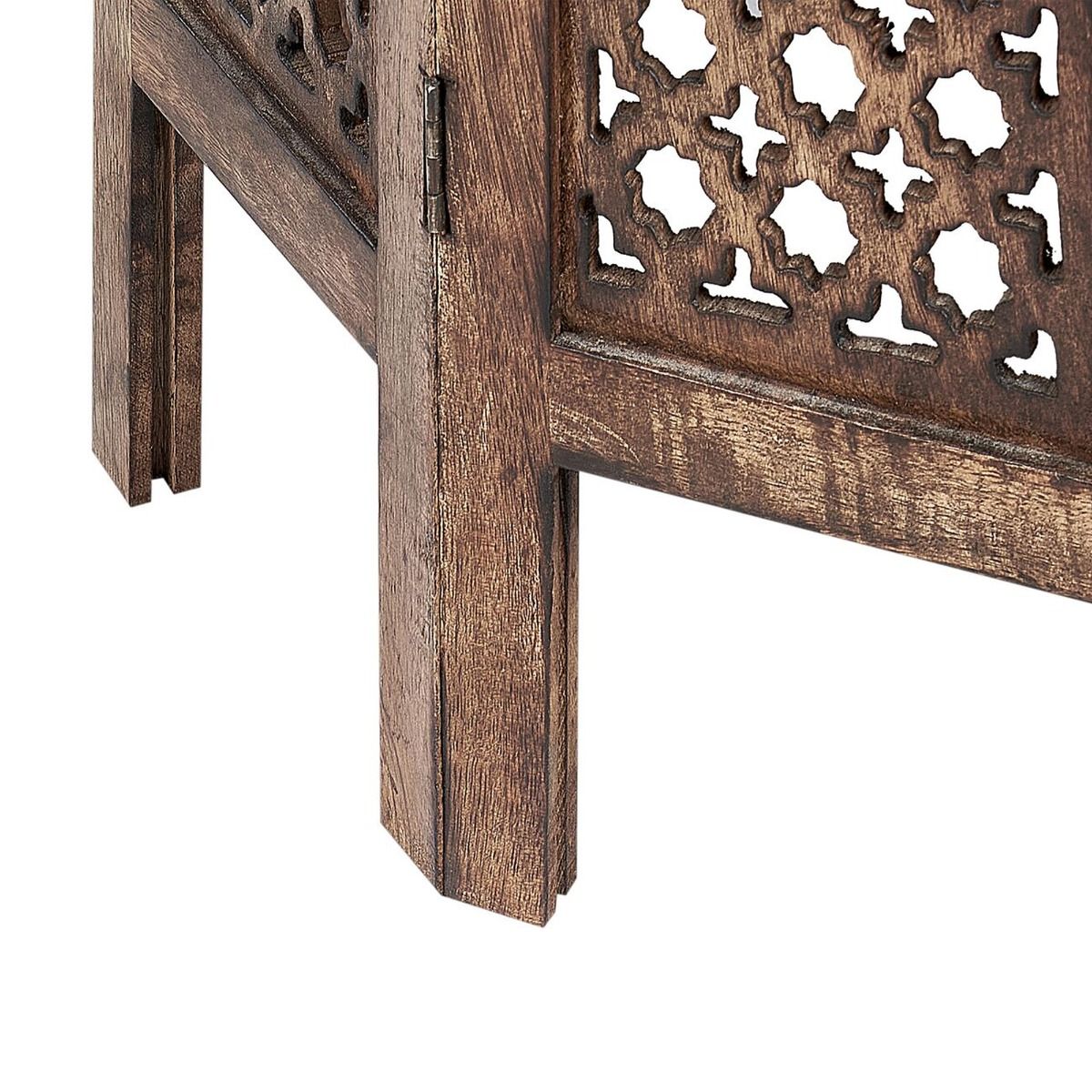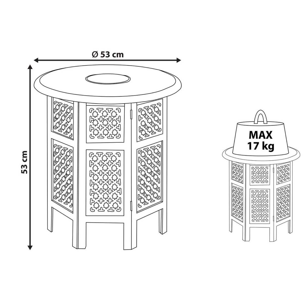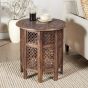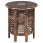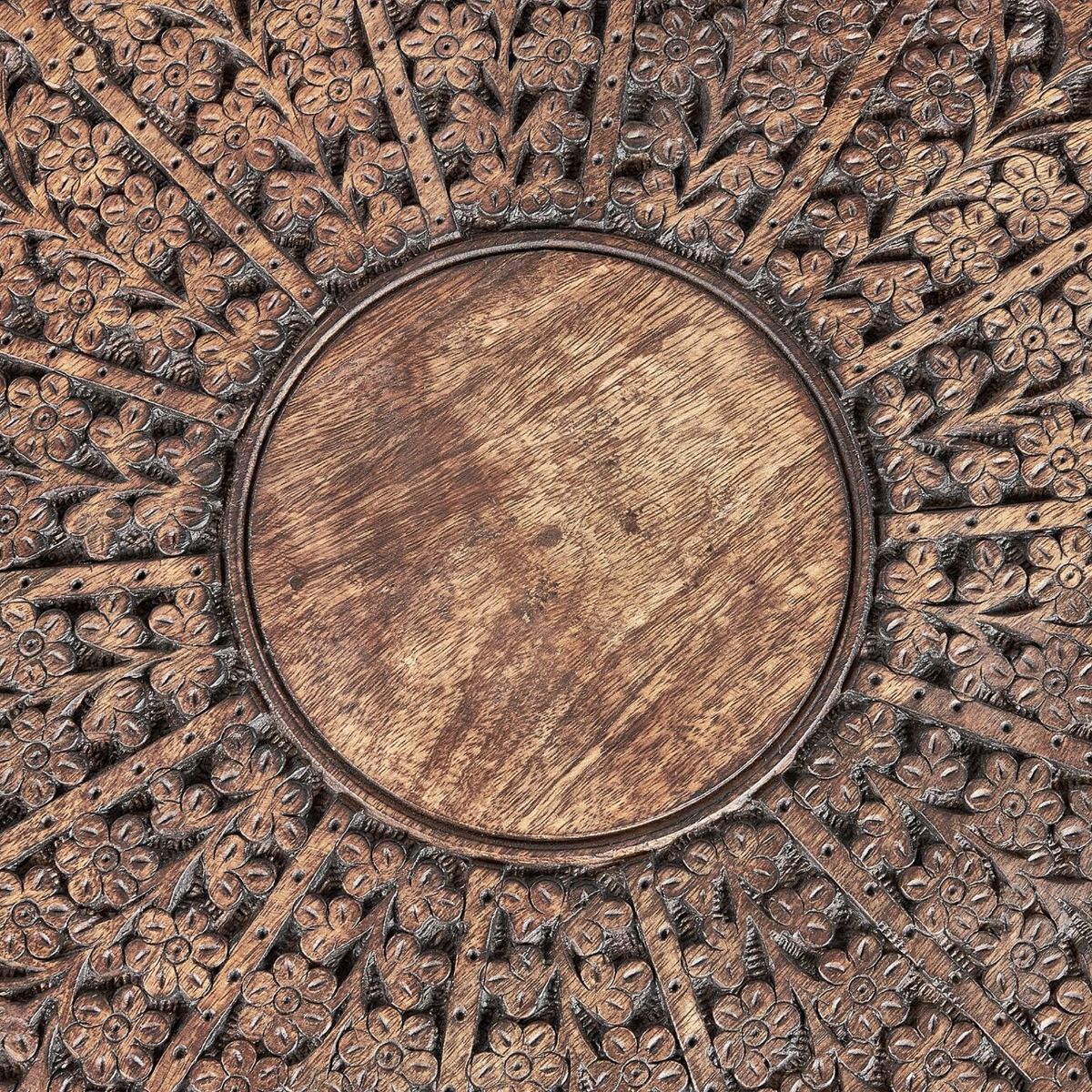 Add an oriental touch to your interior with this functional yet decorative side table. Handmade with utmost precision from mango wood, it gives off a natural character thanks to the visible grains and structure of this material. The base features an intricate openwork design with interesting carvings that will certainly attract the attention of any of your guests. Additionally, its compact size makes it a perfect addition to limited spaces. Details: Color: Dark Wood. Main material: Mango Wood. Additional material: Mango Wood. Weight: 6 Assembly: Full Assembly Required Wood type: Mangifera indica Wood Origin: India Weight Capacity: 17