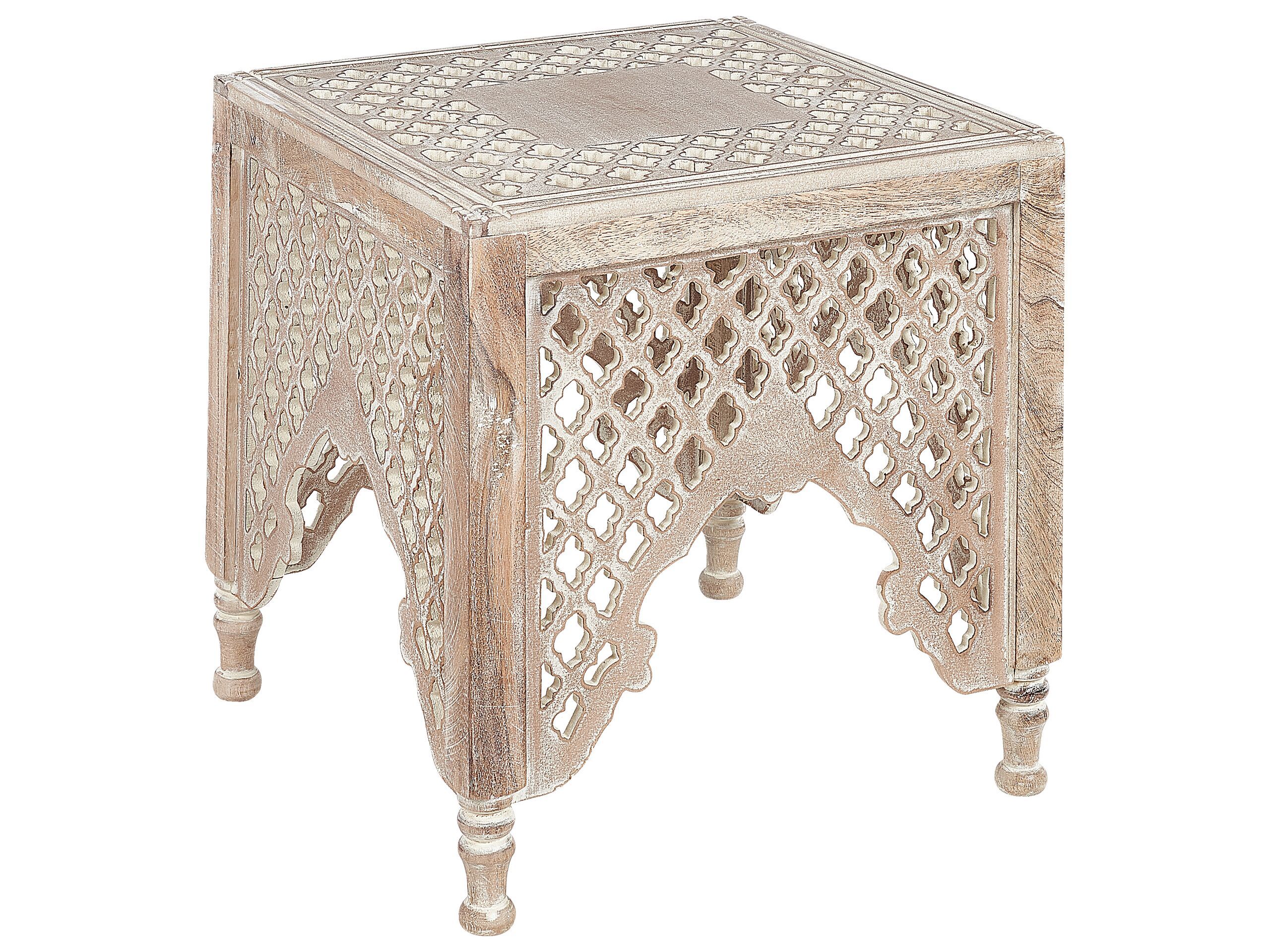 Introduce an oriental vibe to your interior with this handmade side table. The piece is crafted out of durable mango wood and high-quality MDF - both materials make it long-lasting, and at the same time low maintenance. Its top will allow you to place various decorations, plates or drinks on it. Thanks to its unique design, and the fact the table is handmade, the product is going to stand out in your home and will definitely draw the attention of all your house guests. Details: Color: Light Wood. Main material: Mango Wood. Additional material: Mango Wood. Weight: 4 Assembly: Does Not Require Assembly Wood type: Mangifera indica Wood Origin: India Weight Capacity: 12 Legs Height: 8