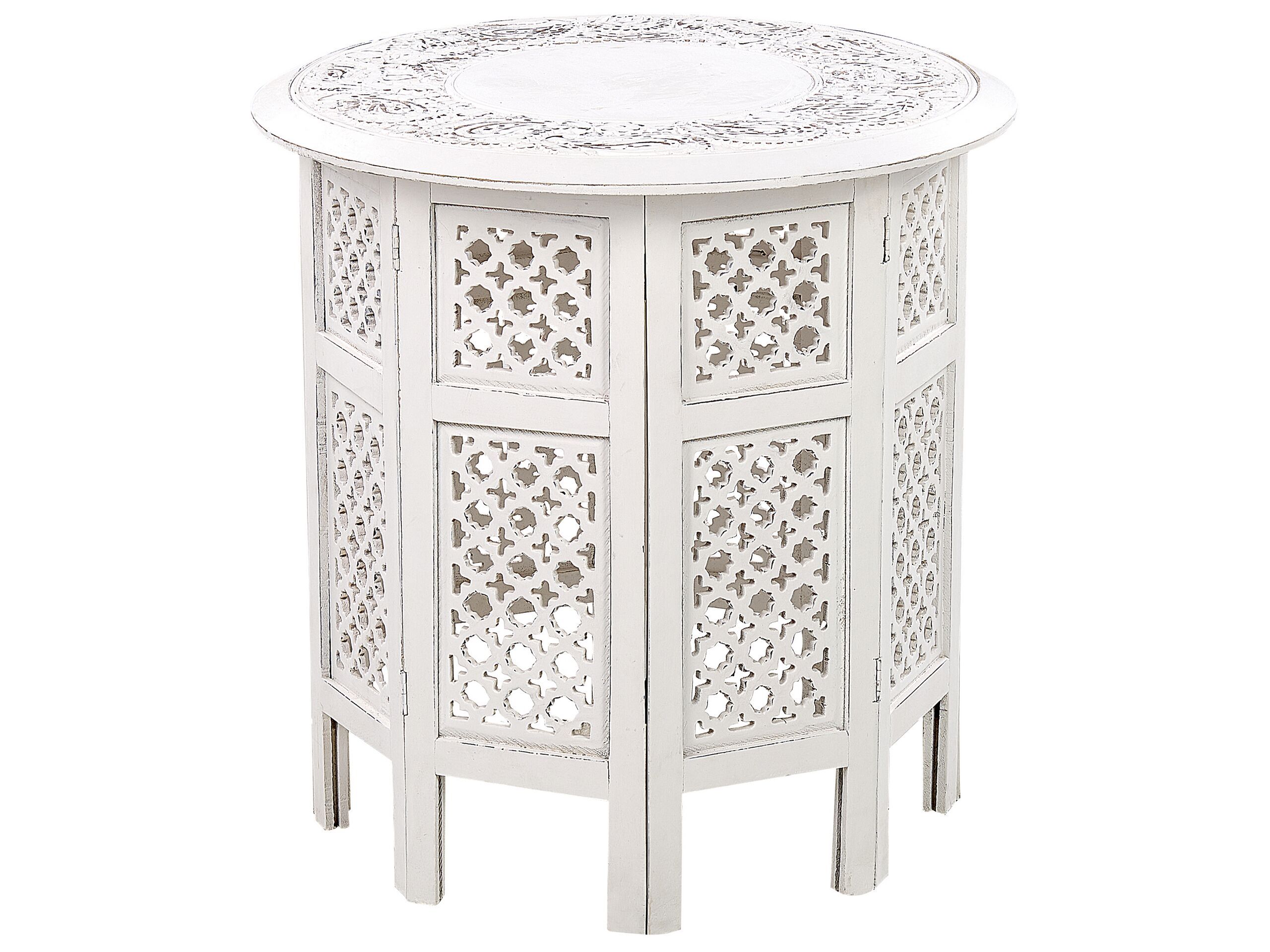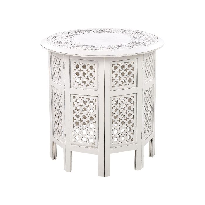 With this side table, you will bring an oriental accent to any room. It features a unique shape and a precisely crafted pattern. Additionally, the round tabletop is covered with a distressed effect for a vintage look. It will serve well in a hallway, living room or a bedroom as a place to put your small accessories. Details: Color: White. Main material: Mango Wood. Additional material: Mango Wood. Weight: 6 Assembly: Partial Assembly Required Wood type: Mangifera indica Wood Origin: India Weight Capacity: 12