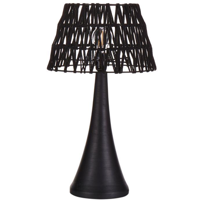 Make your space stand out and bring a contemporary vibe to it with this stylish table lamp. Its bold, mango wood base, combined with handmade cotton shade, makes it a real eye-catcher in any modern setting. Thanks to its design, it emits pleasant, warm light, that will illuminate your desk or bedside area. Details: Color: Black. Main material: Cotton. Additional material: Iron, Mango Wood. Material Composition: 100% Cotton Weight: 1.4 Assembly: Partial Assembly Required Wood type: Mangifera indica Wood Origin: India