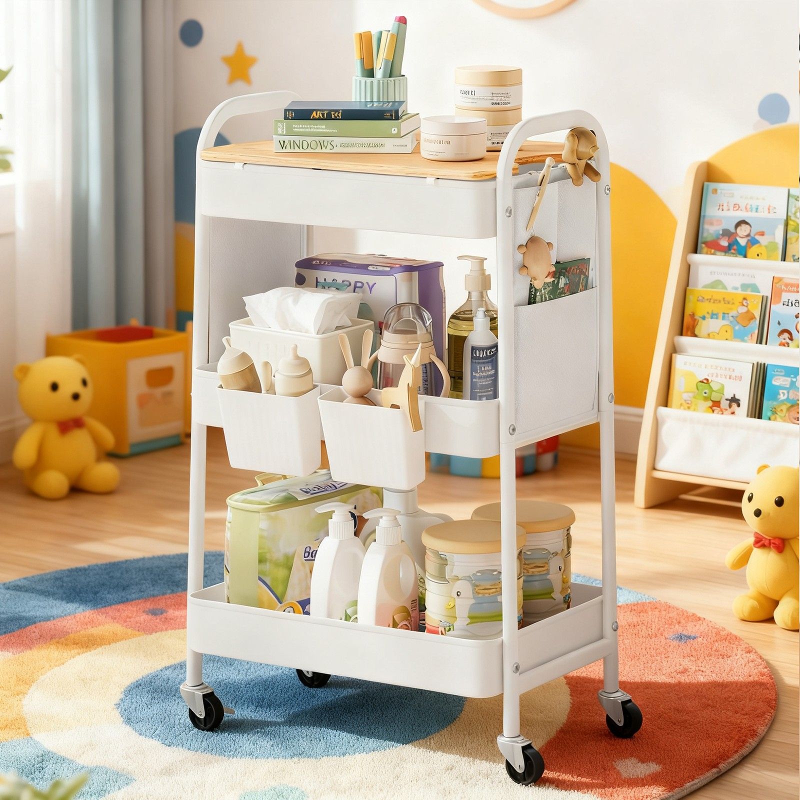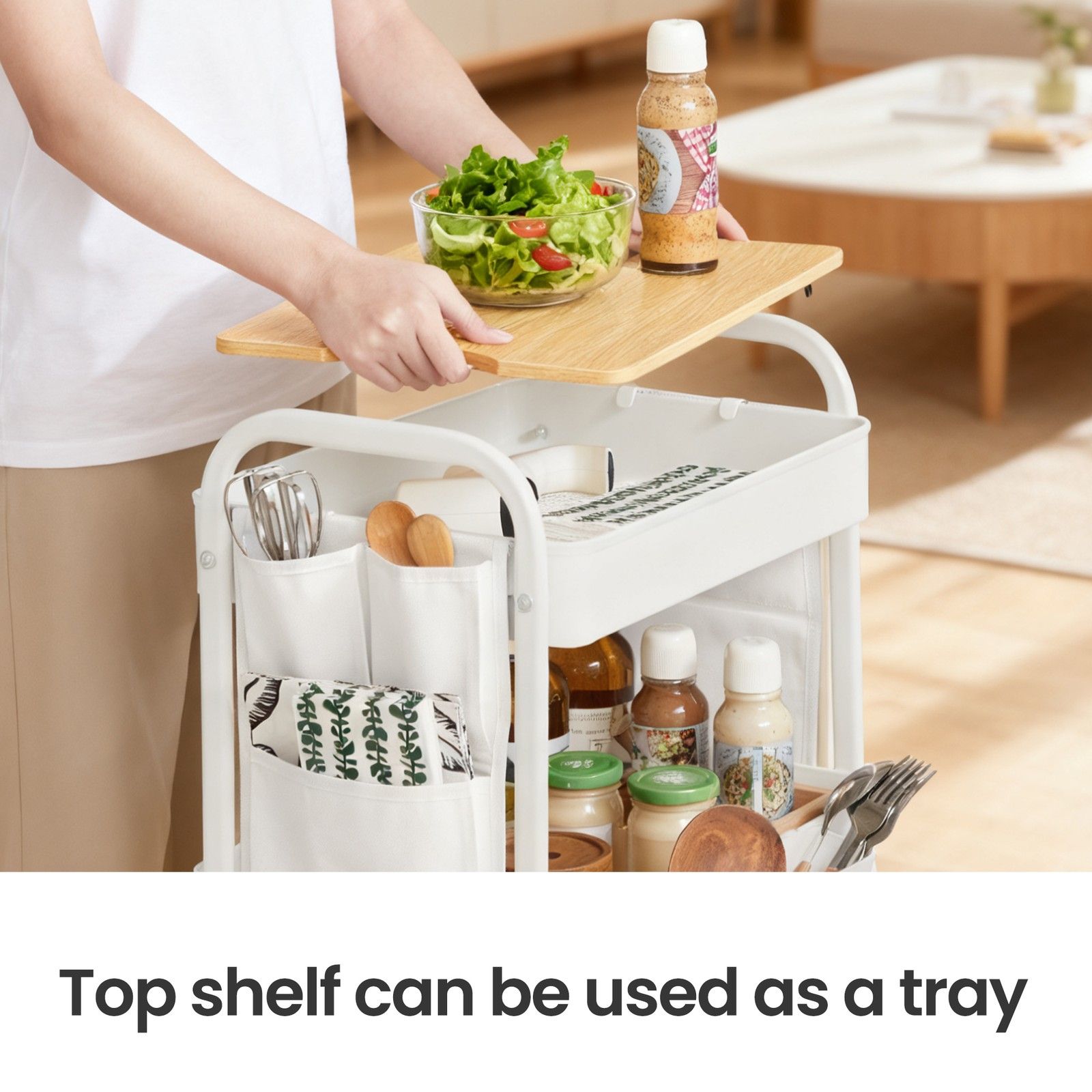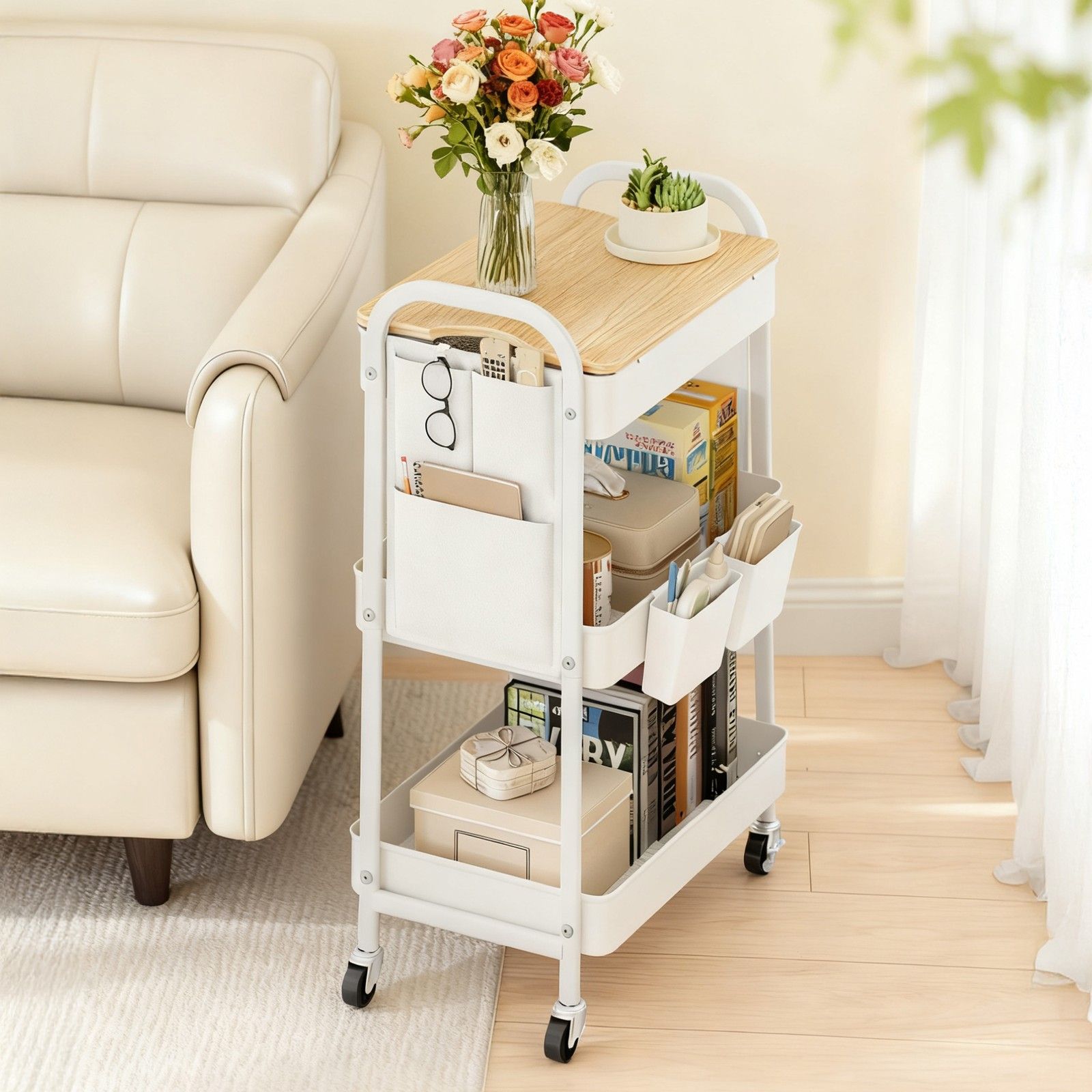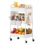 MAPLETHORN 3-Tier Rolling Organizer Kitchen and Dining Trolley with Tabletop and Removable Hanging Cups - White