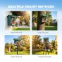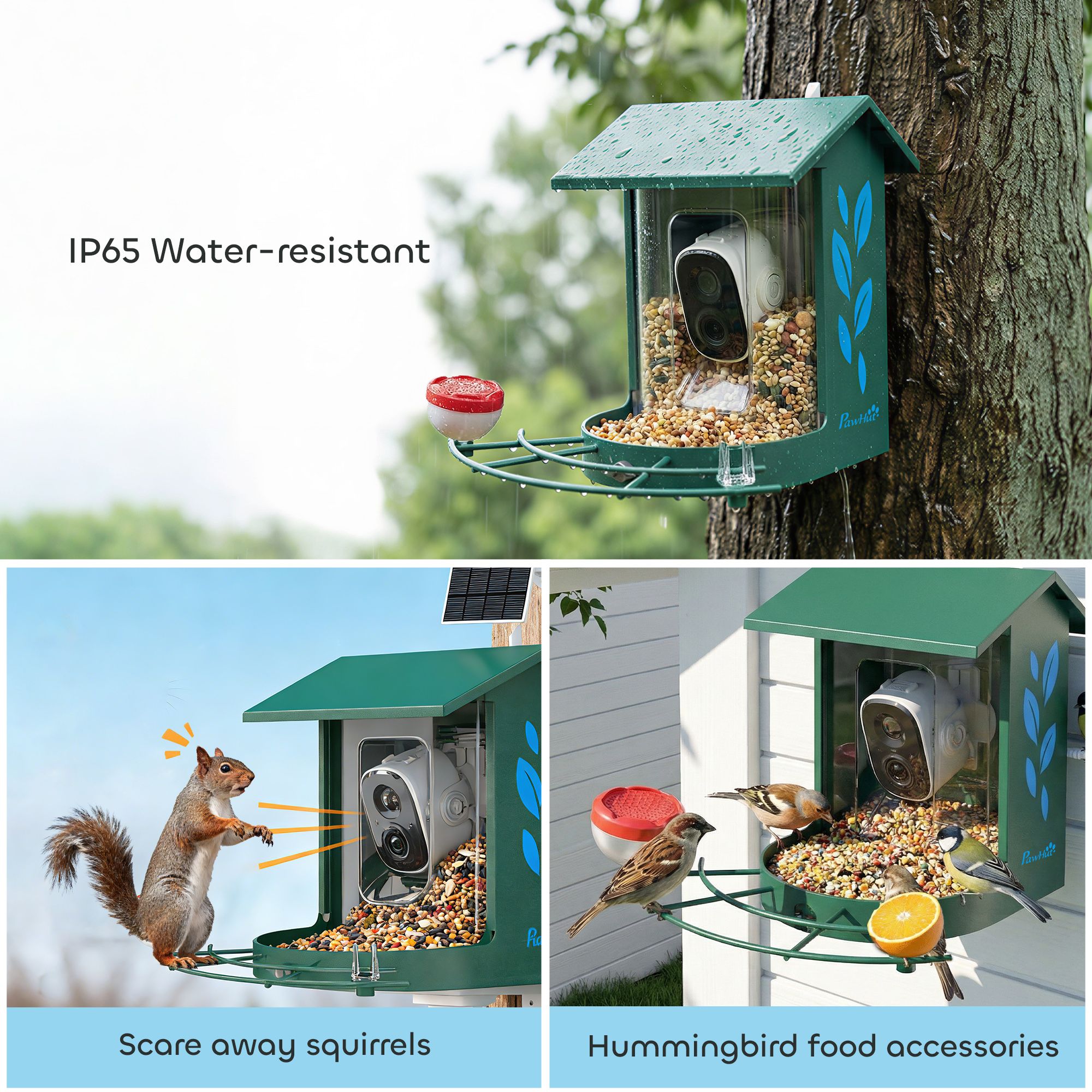 Smart bird feeder with camera: advanced ai identifies 16,000+ bird species and sends instant alerts. The 2k camera with a 142° wide-angle lens captures detailed feather shots and can also detect humans, vehicles and pets for added security. Three users can watch live feed: this bird feeder camera supports up to three people viewing the live stream from the app at once. The built-in two-way microphone allows you to listen to birdsong or shoo away squirrels in real time. 360 ° solar panel and 5200ah battery: the rotating solar panel and long-lasting battery provide stable power for up to five months. 5 l food container, hummingbird attachment and fruit fork to attract a wide variety of species. Outdoor use: built with a solid steel shell to deter squirrels, this ip65 waterproof bird feeder camera performs reliably in rain, sun and snow for true all-weather use. Flexible setup: easy to mount on a wall or pole for a great viewing angle.