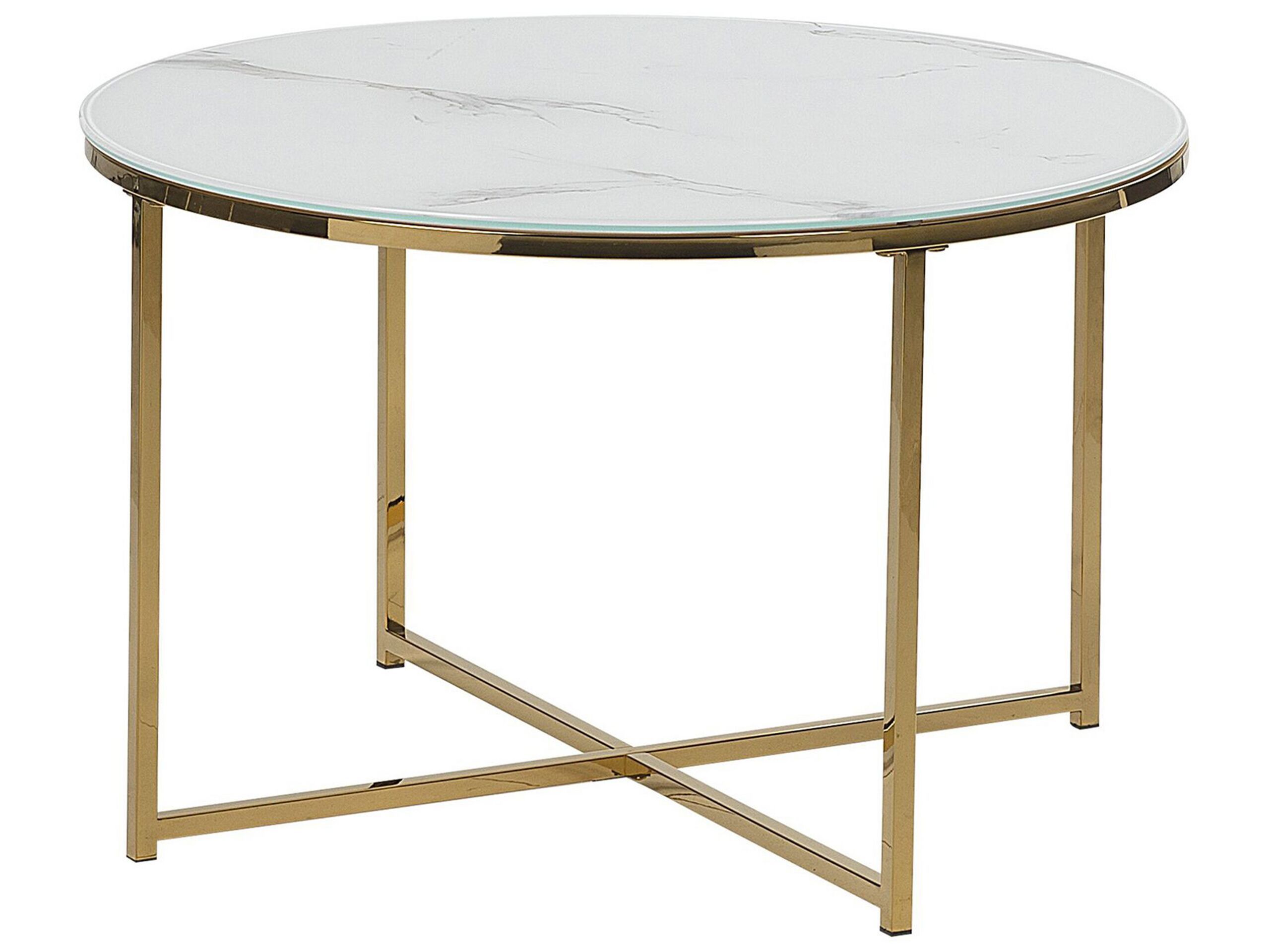 Decorated with this shiny coffee table, every living area set-up becomes more glamorous. Featuring round tempered glass top with marble effect and sturdy stainless steel legs in shiny gold, it not only looks luxurious but also lasts for many years. Place it in front of the sofa or next to your favourite armchair and let it upgrade your rooms' look. Details: Color: White, Gold. Main material: Tempered Glass. Additional material: Stainless Steel. Weight: 9 Assembly: Full Assembly Required Weight Capacity: 15 Legs Height: 43