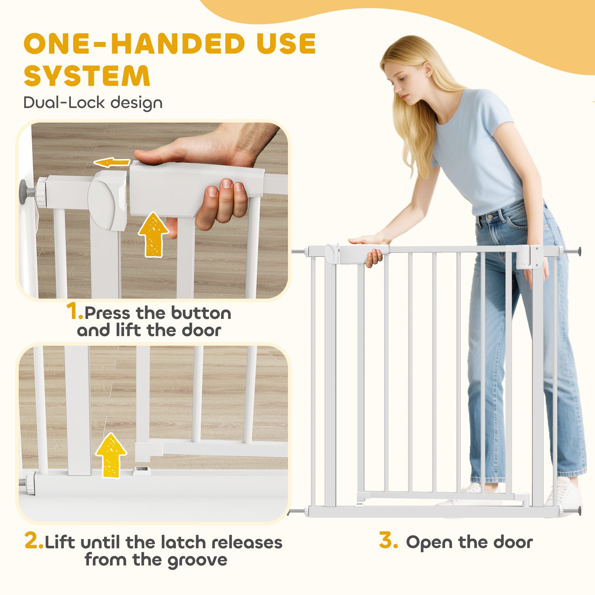 Baby & pet safety gate: tested to en1930:2011 and en71-3 for reliable protection, this pet gate fits 76–82 cm openings and 76 cm high, keeping 6 to 24 months babies and small to medium dogs securely contained, suitable for stair, doorway and hallways. Easy one-hand use: the pet gate opens both ways with a 52 cm wide walk-through, allowing you to pass through easily while holding your baby or bags. Auto-closes under 85° to keep children and pets secure, even if the gate is accidentally left open. Quick & flexible installation: set up the baby gate in minutes without drilling using the pressure-fit system, no wall damage or tools needed. For extra stability, screws can also be used, suitable for rented homes, busy kitchens and hallways. Dual-lock design: a smart two-step release requires simultaneous up-and-down pressing, stopping curious toddlers or pets from opening the baby gate, while adults can unlock it easily, keeps them away from stairs, hot kitchens or