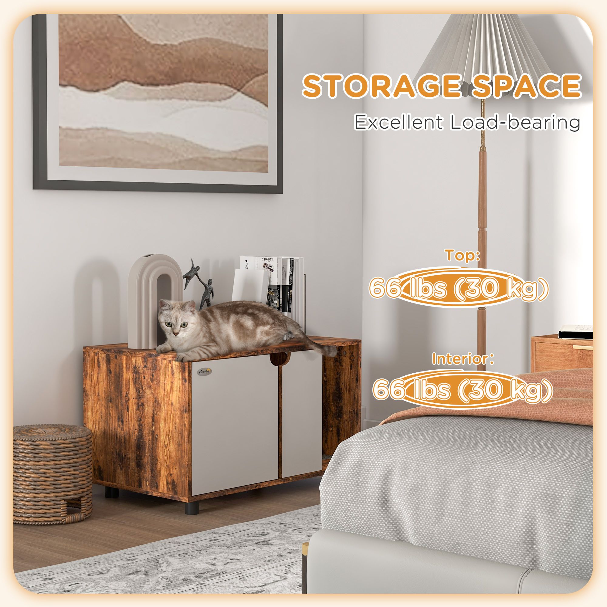 Versatile cat litter box: this cat enclosure acts as a cosy cat house or stylish side cabinet, seamlessly blending with home Decor while meeting your pet's privacy needs. Easy maintenance: double opening doors for cleaning this cat litter house with ease. A sand drain pad at the entrance, preventing litter from spreading around your home. Particleboard material: a strong and stable build, this cat litter box enclosure can handle up to 30 kg on top and inside. Two vents and elevated legs: allows air to circulate through and underneath the litter box enclosure, keeping your pets cool and comfortable. Dimensions: 48 H x 80 W x 48 D cm. Weight capacity: inside: 30 kg. Suitable for cats under 5 kg. Assembly required
