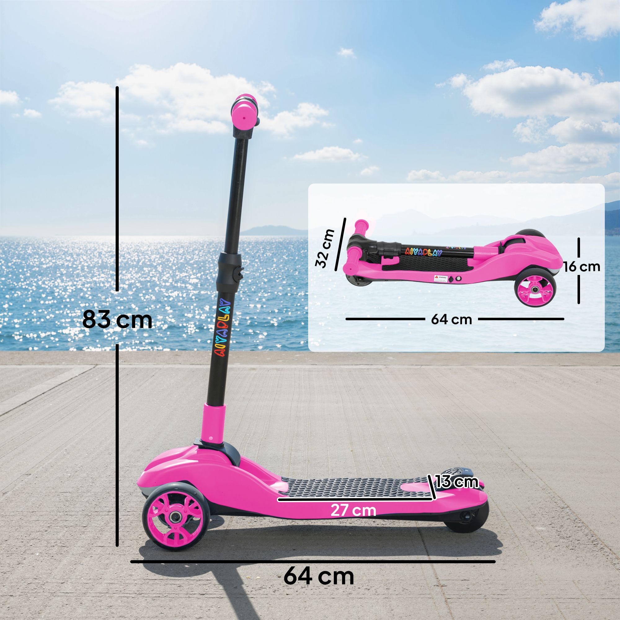 Overall dimensions: 83H x 64L x 29W cm, Folded: 16H x 64L x 32W cm, Front wheel size: Dia12 x 4W cm, Rear wheel: Dia9 cm