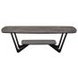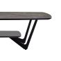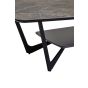 This rectangular coffee table showcases a stylish grey marble effect ceramic top supported by angular black metal legs and includes a practical lower black shelf.