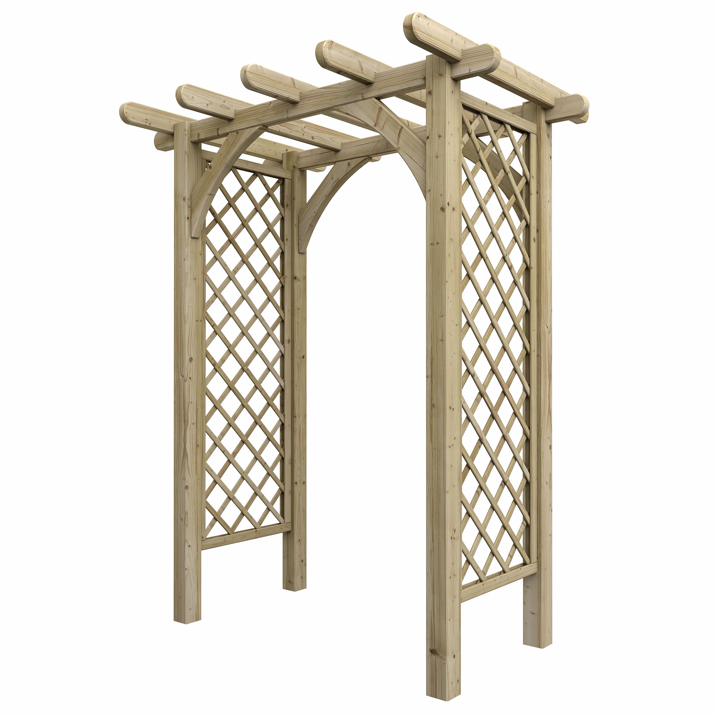 This heavy-duty arch will create an impressive statement piece in any garden whether it’s to add height and shape or to create a divide to garden spaces. The diamond lattice sides are perfect for supporting climbing plants. The concaved curve shape to the diagonal bracing and rounded roof rafters adds further depths to its elegant charm. Pressure treated timber ensures this sturdy structure is built to last.