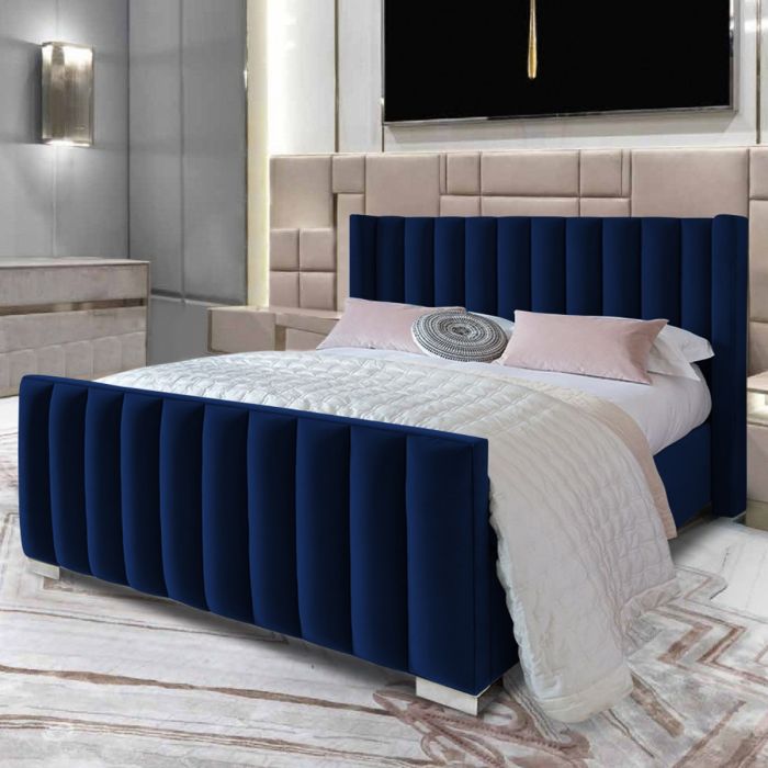 Take the look of your bedroom to new decorative heights with this ultra-modern bed, handmade in the UK. Rich velvet upholstery gives this bed a true upscale feel and epitomizes fine living while channel tufting along the headboard keeps the padded material inside plump and aloft—so it cradles your body while you sit up in bed to watch TV or read. Chrome metal legs gives this bed an elegant look and finish
