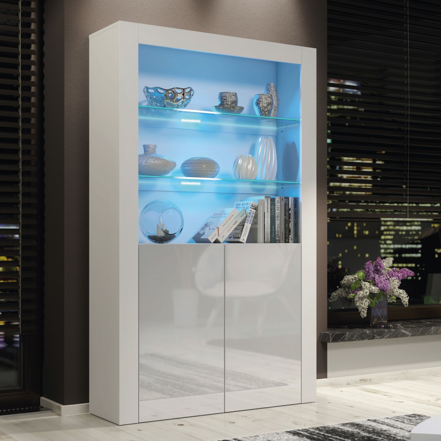 The MENTON Display Cabinet adds a touch of contemporary elegance to your living space, offering the perfect blend of style and practicality. Measuring 100cm (W) x 170cm (H) x 35cm (D), this sleek cabinet enhances any modern interior with its refined design while providing ample storage and display options. The matte-finished body contrasts beautifully with glossy push-to-open doors, creating a clean and handle-free aesthetic. Behind the two doors lies a generous storage area divided by an internal shelf, offering an organized solution for your essentials. Please note: the Oak with Black version features matte black doors, providing a unique and understated alternative to the glossy finishes available in other color options. Crafted from sturdy 16mm MDF and chipboard, the MENTON Display Cabinet is built to last while maintaining its clean and sophisticated look, making it a practical and stylish choice for any room in your home. Available in White & Gloss Doors, White & Grey Gloss Doors, Black & Gloss Doors, Walnut & Black Gloss Doors, Oak & White Gloss Doors, Oak & Black Matt Doors, and Dark Grey & Gloss Doors.
