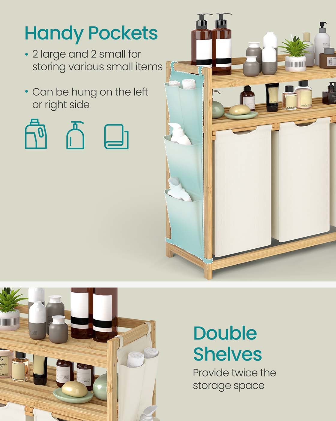 MERRISHORE 150L Laundry Basket with Multiple Compartments Shelf and Side Pockets - White