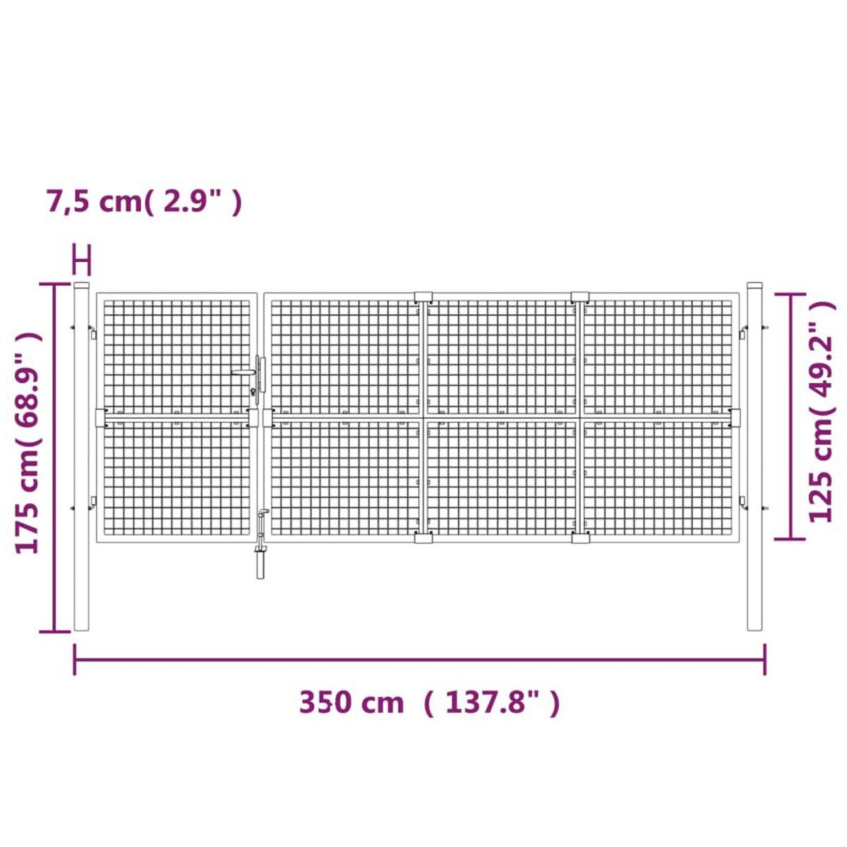 The garden gate is a great combination of strength, stability, and corrosion resistance! It will surely be an ideal entry point for your garden, patio, or terrace! Durable material: Steel is an exceptionally hard and strong material. It offers sturdiness and stability. Galvanisation provides better protection against corrosion and is useful for products that'll be used outdoors as well as in harsh environments.Lockable design: The outdoor gate has a ground stake for the large bottom bolt, which ensures the patio gate can be locked well.Easy assembling: The steel garden gate has two side posts with bolt hinges for easy installation.